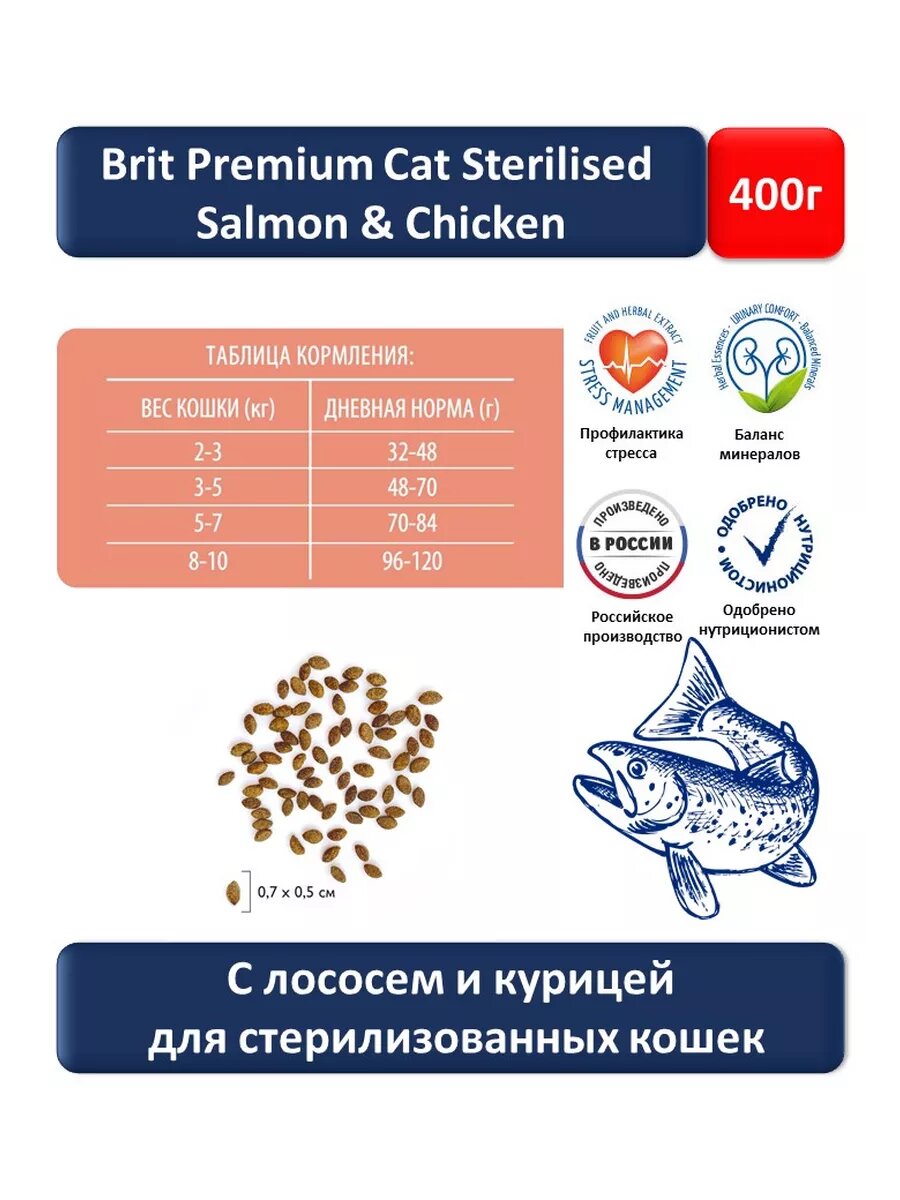 Сухой корм BRIT PREMIUM CAT STERILISED SALMON & CHICKEN для взрослых кастрированных котов и стерилизованных кошек с лососем и курицей (0,4 кг)