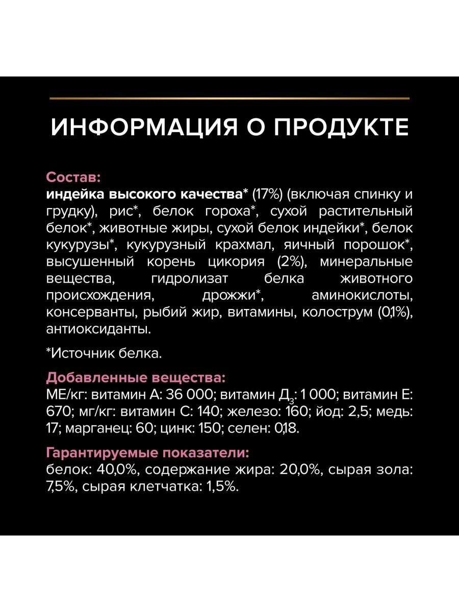 | Состав | индейка (17%**), рис**, сухой белок индейки**, концентрат белка гороха**, животный жир, соевый белок**, кукурузный глютен**, кукурузный крахмал, высушенный корень цикория (2%*), минеральные вещества, вкусоароматическая кормовая добавка, дрожжи**, аминокислоты, витамины, рыбий жир, консерванты, антиоксиданты; *натуральный пребиотик, **источники протеина |