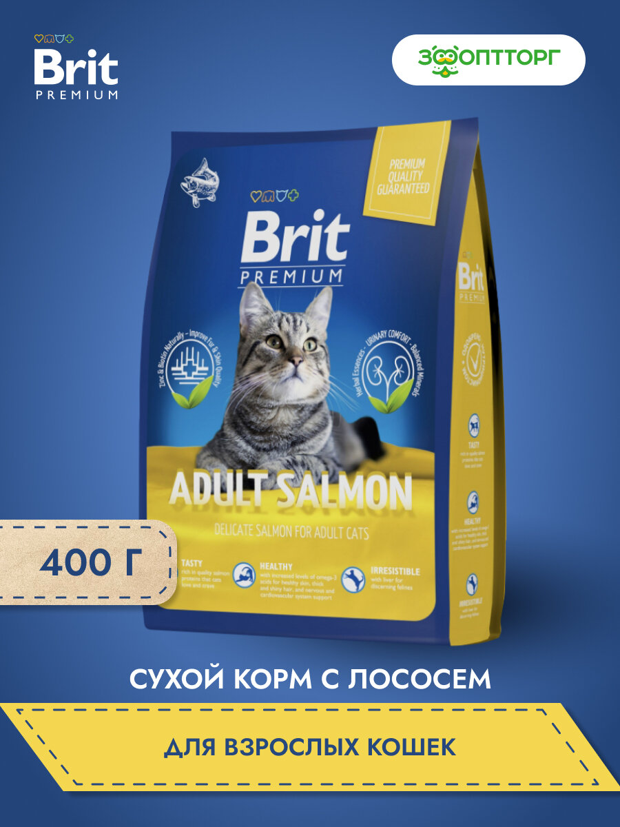 Брит Premium Cat Adult Salmon сухой корм премиум класса с лососем для взрослых кошек, 0,4 кг