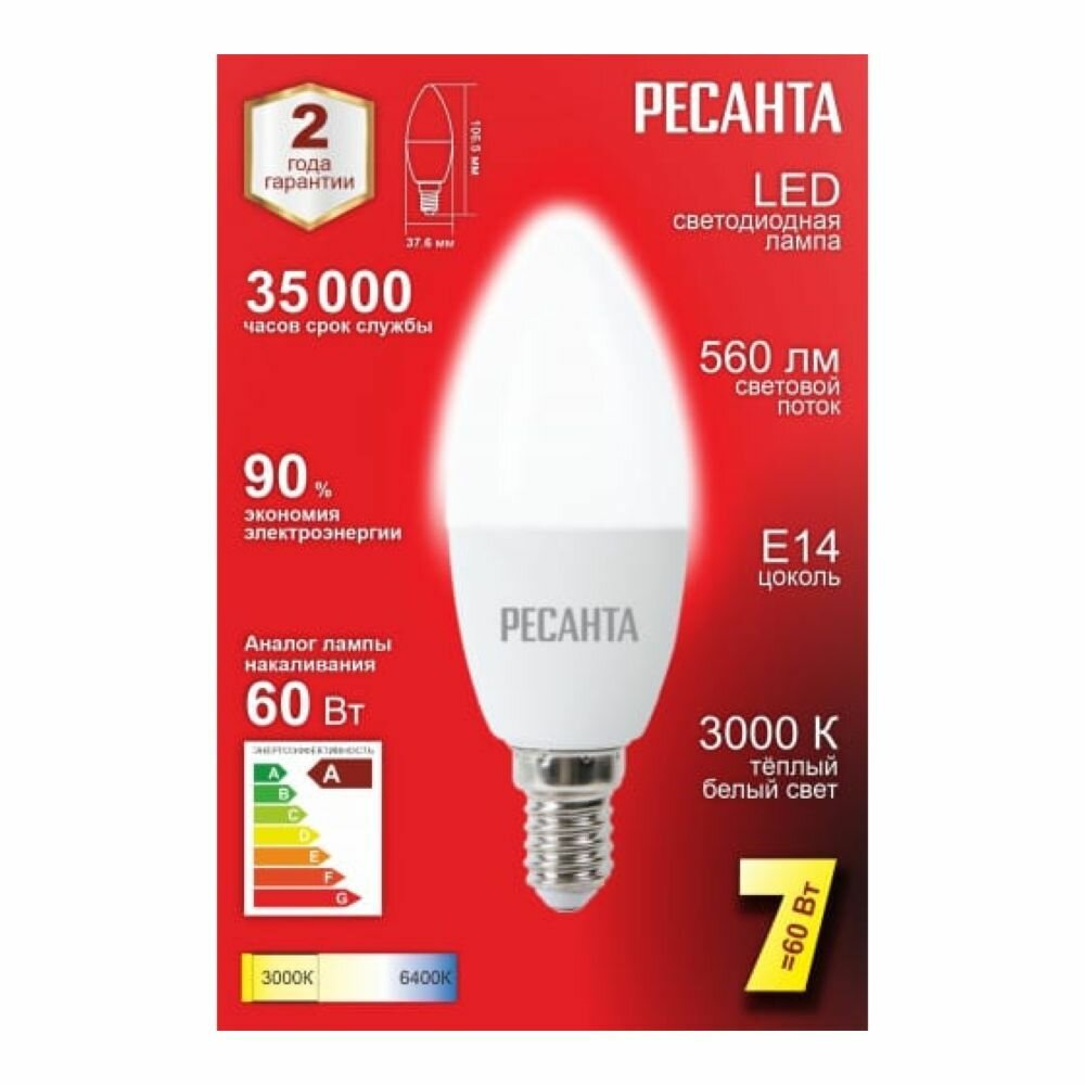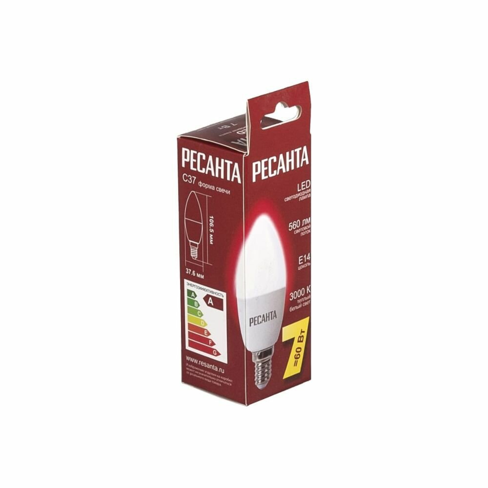 Светодиодная лампа Ресанта LL-R-C37-7W-230-3K-E14 (свеча, 7Вт, теплый, Е14) 76/1/5