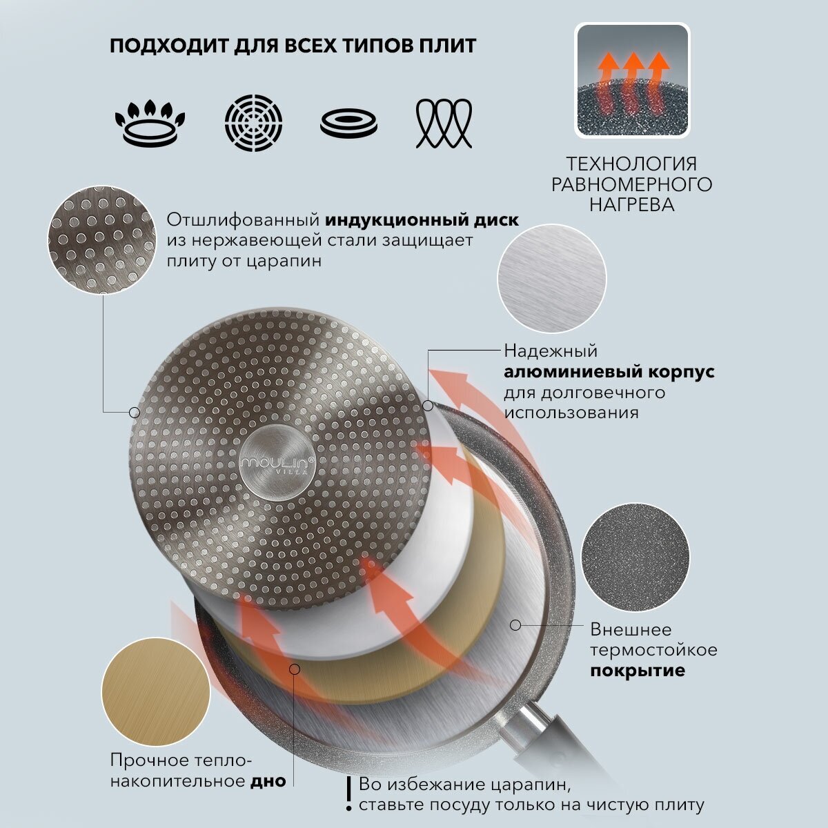 Сковорода глубокая Moulin Villa Chef CH-28-DI из алюминия, 5-слойное антипригарное покрытие, крышка, съёмная ручка, индукция, 28 см интересное: