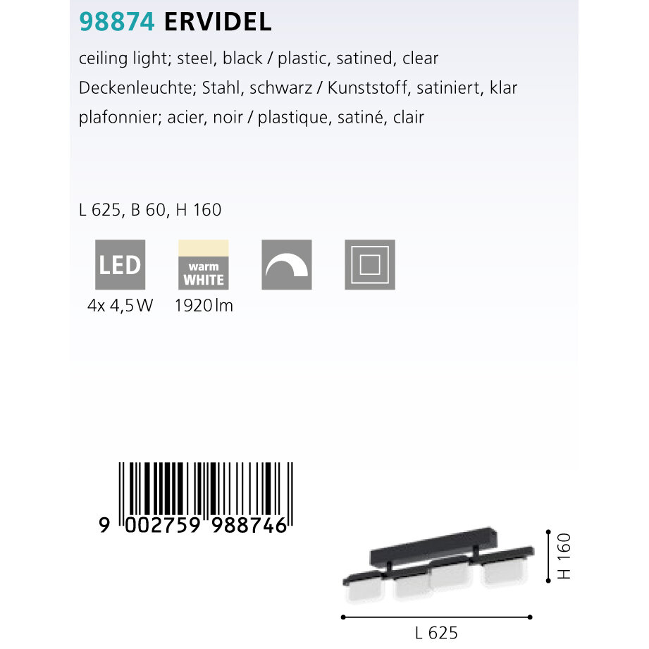 Eglo 98874 Светильник потолочный ERVIDEL, LED 4x4,5W, 1920lm, L625, B60, H160, сталь/пластик, черный/прозрачный/матовый 98874