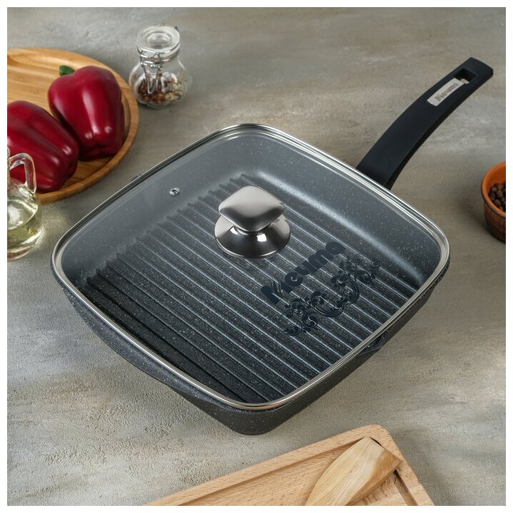 Сковорода гриль Мечта квадратная 28х28 см Гранит с антипригарным покрытием с несъемной ручкой и крышкой, НЕ индукционная