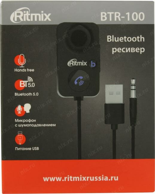 Купить Автомобильный Bluetooth ресивер Ritmix BTR-100, порт питания- USB-A, подключение AUX (3.5мм), Bluetooth 5.0