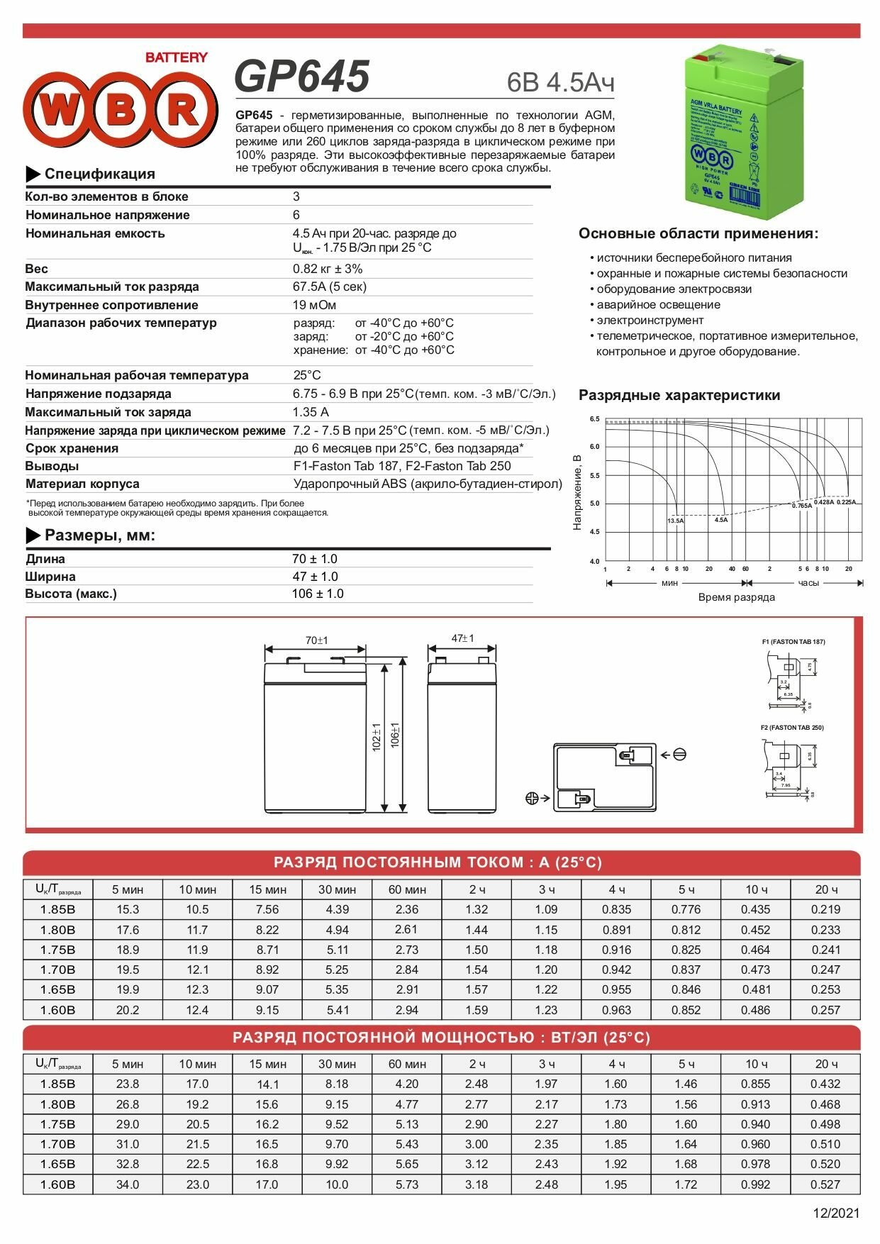 | Дополнительная информация | WBR GP-645 - герметизированные, выполненные по технологии AGM, батареи общего применения со сроком службы до 7 лет в буферном режиме. Эти высокоэффективные перезаряжаемые батареи не требуют обслуживания в течение всего срока службы. |