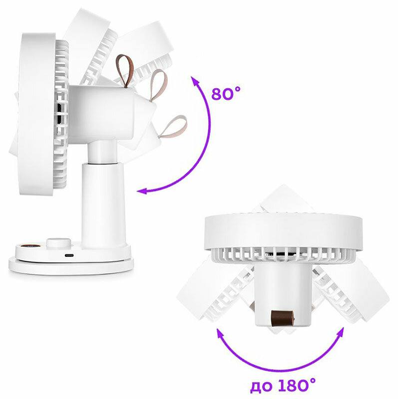 | Плюсы: | Вентилятор пришёл полностью разряженный. Поставила на зарядку и спустя минут 20 было уже 20%. Включила и удивилась. Это просто маленькое чудо. Даже на второй скорости у него отличный обдув. Инструкция прилагается, но и без неё интуитивно все понятно. Внешний вид вентилятора это отдельный респект производителю. Очень качественный пластик, цвет кипельно белый, подсветка на корпусе красивого фиолетового цвета, его можно повесить на стену или прикрепить к столу прищепкой. Кроме всего прочего вентилятор бесшумный. Совсем. Его не слышно. Управлять этим чудом можно с пульта. Вообщем это маленький настольный вентилятор с функционалом и возможностями большого напольного. А работа от аккумулятора делает его незаменимым для любого помещения, ставь, куда хочешь. Можно брать на природу, в кемпинг. Потому что заряжается он и от пауэрбанка и от компьютера.Однозначно это любовь с первого взгляда) |