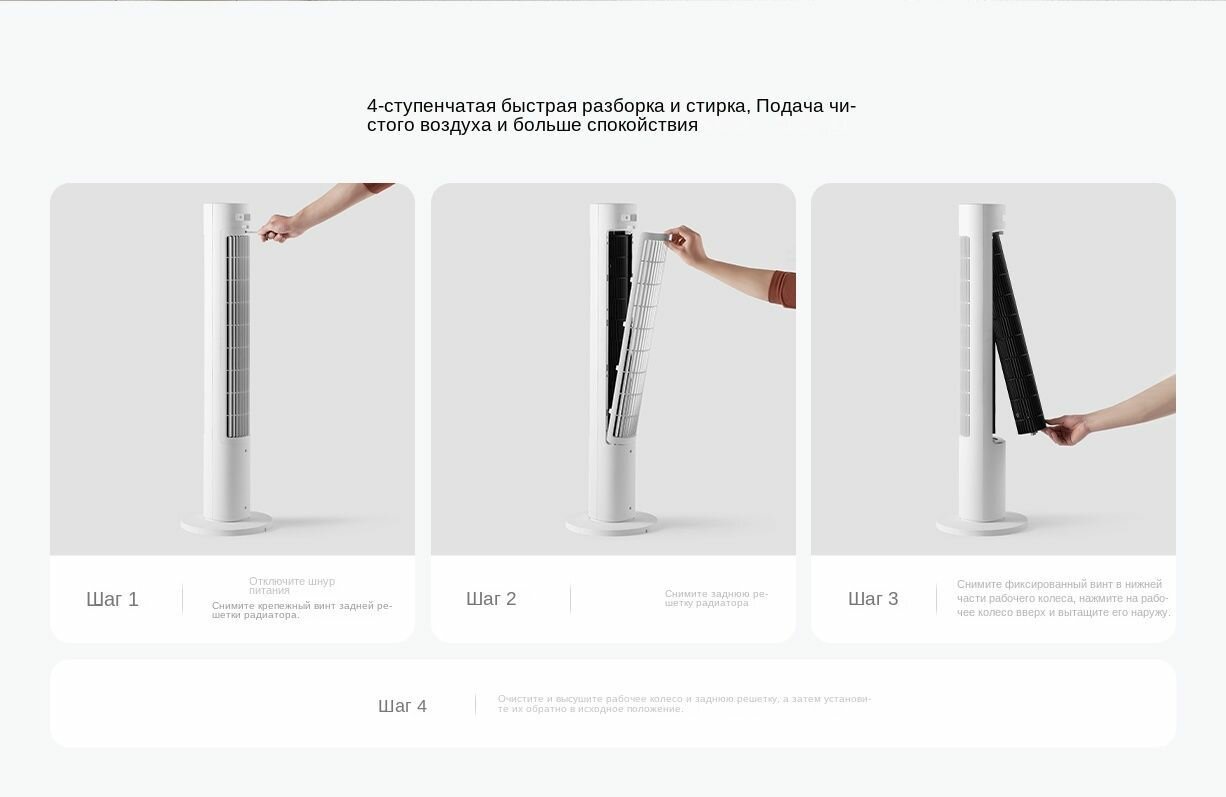 Интересный дизайн,впишется в любом интерьере.Мало места занимает в вертикальном объеме.Ночной режим и природный ветер уникальны своей запрограммированной работой.Чтоб пользоваться управлением со смартфона,нужно скачать приложение MiHome и выставить в настройках регион Китай,только тогда приложение увидит ваш вентилятор.Скорость обдува можно менять в процентах с плавным ходом от 1% до 100%.До середины обдув практически не слышен.Далее с увеличением скорости прибавляется звук ветра напоминающий звук работы вентилятора с кондиционера.По сути в вентиляторе и стоит барабанный вентилятор от кондиционера.Для вентиляторов подобного типа именно в этом есть возможность легко вынуть барабан и промыть от пыли |