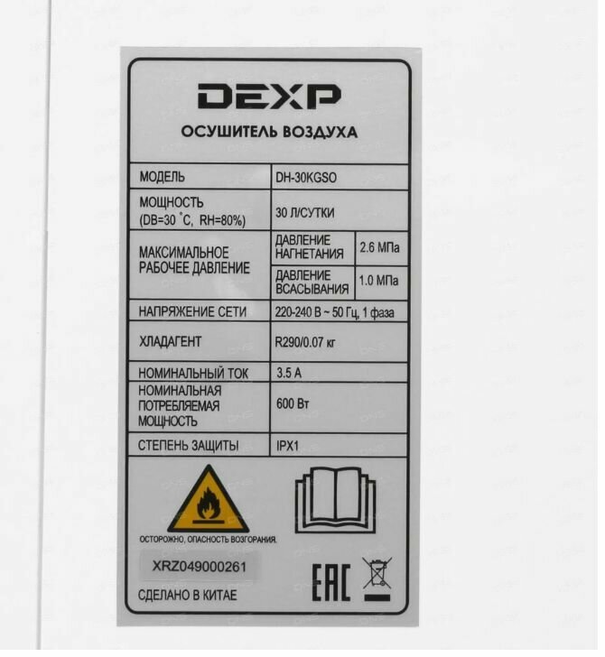 Осушитель воздуха DEXP DH-30KGSO белый 600 Вт, 30 л/сутки, бак - 4 л, очистка воздуха, гигростат, ионизация интересное: