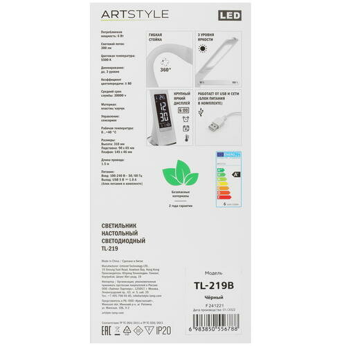 Купить Светильник настольный на подставке Artstyle TL-219B, 6Вт, LED, сенс. упр. часы, календарь, черный