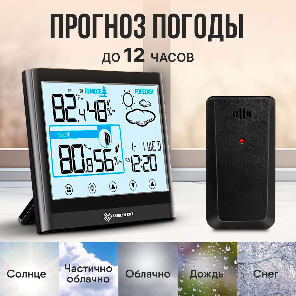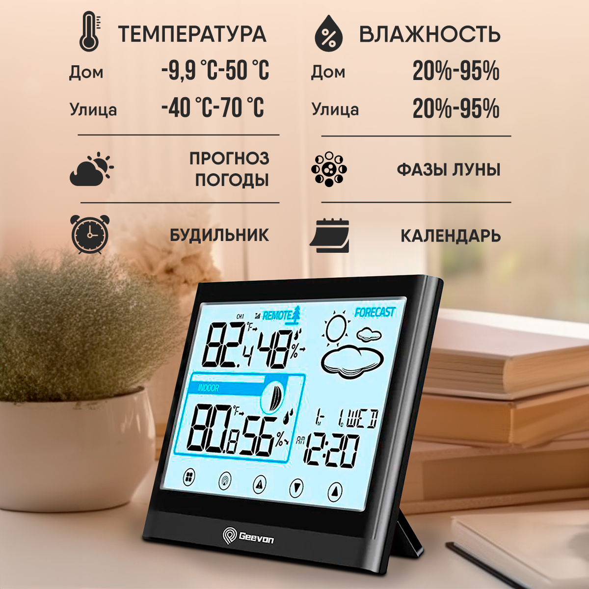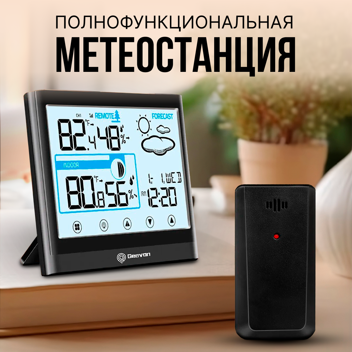 Многозонная метеостанция с беспроводным датчиком. Погода, термометр, влажность, настольные часы, будильник. интересное: