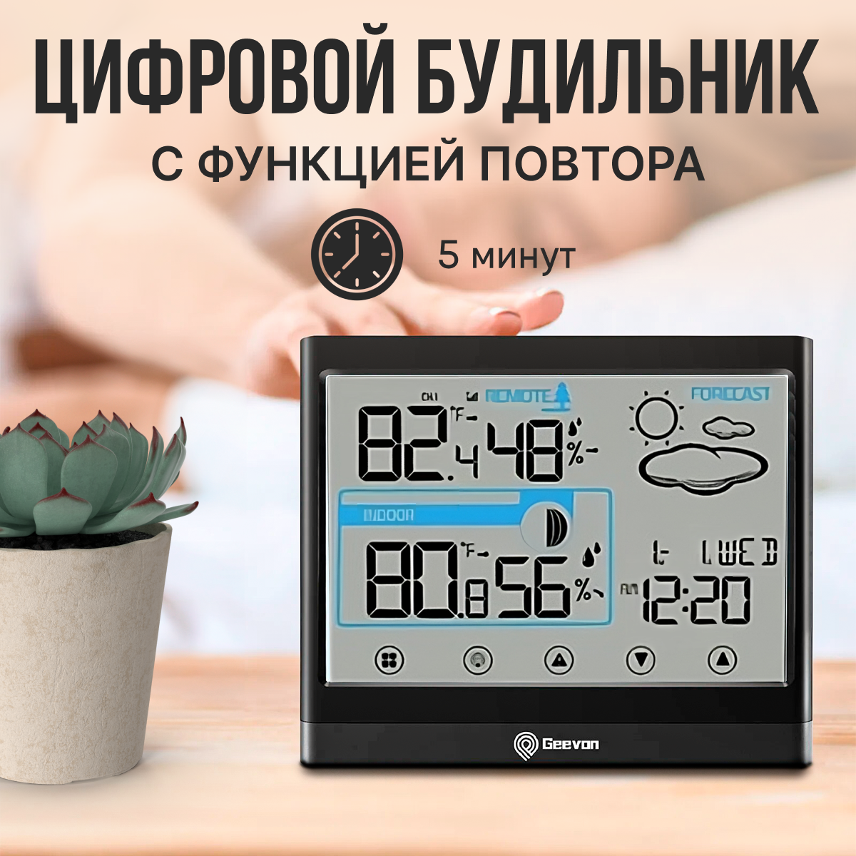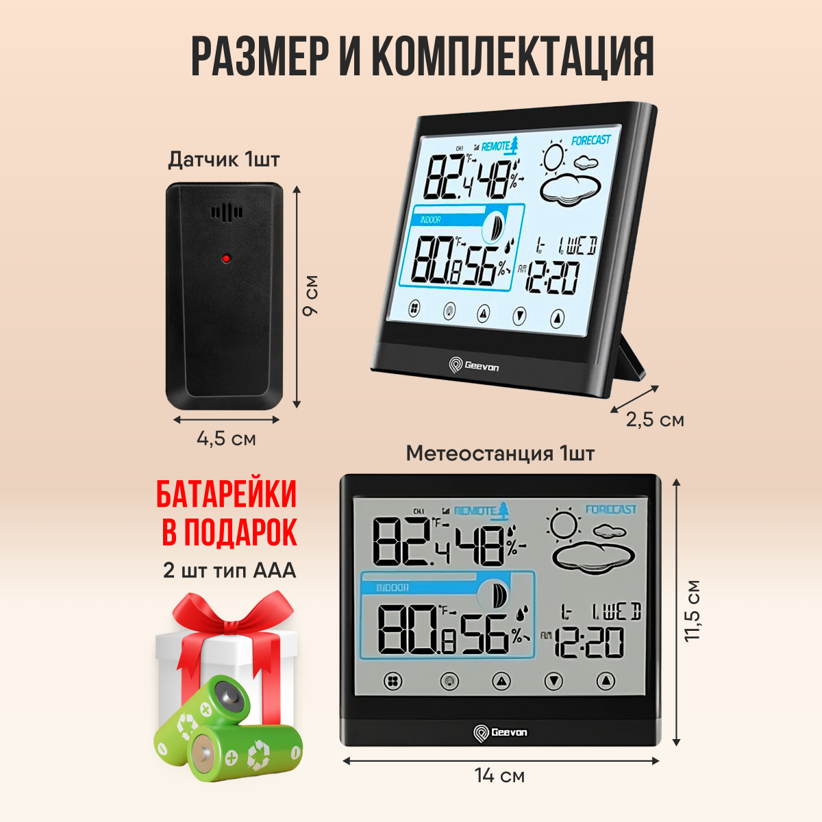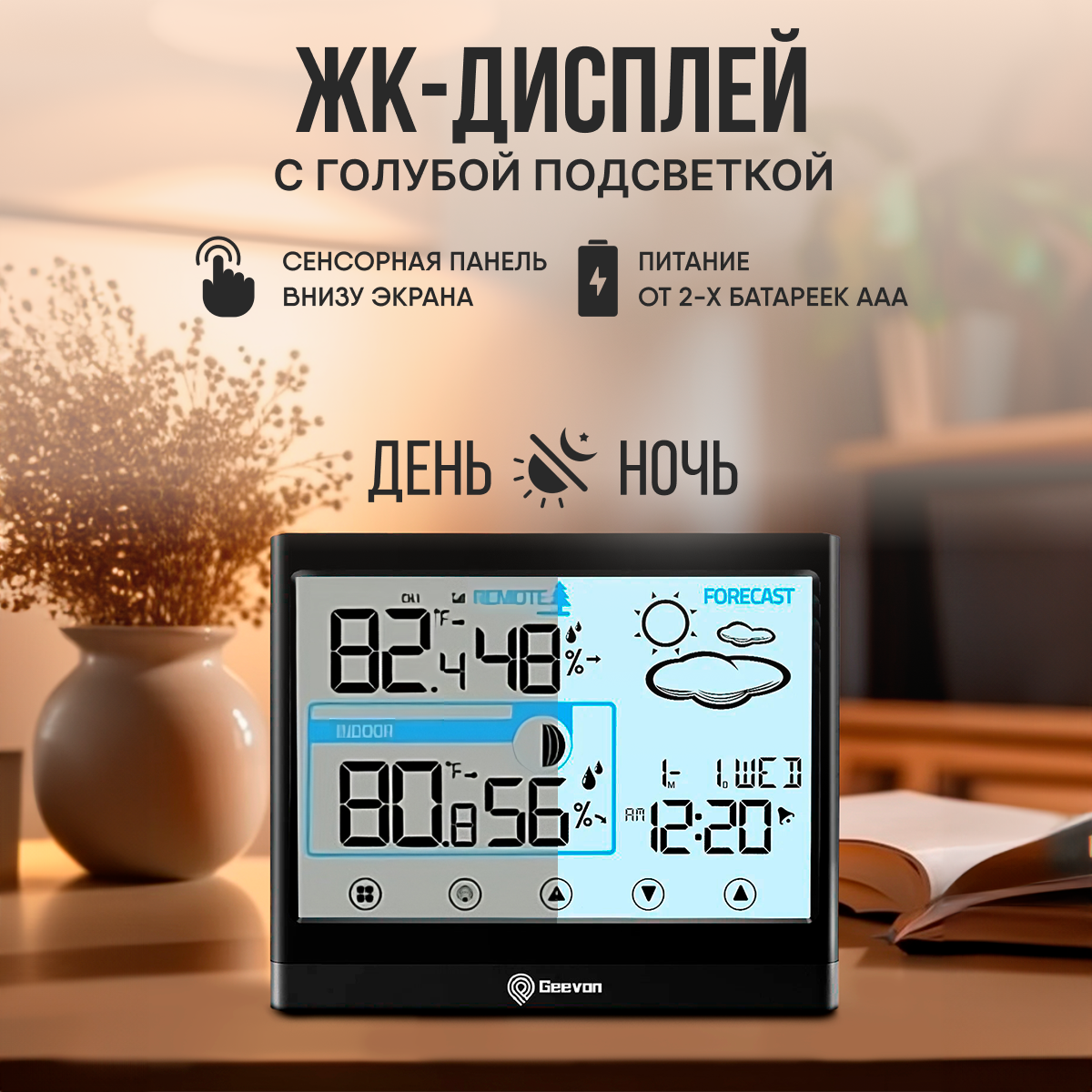 Многозонная метеостанция с беспроводным датчиком. Погода, термометр, влажность, настольные часы, будильник. интересное: