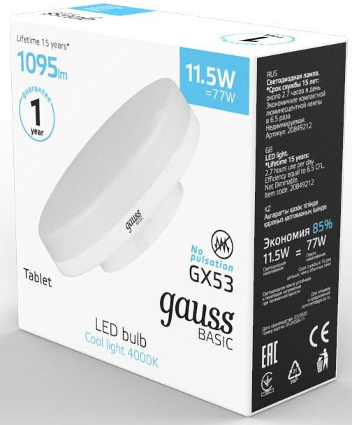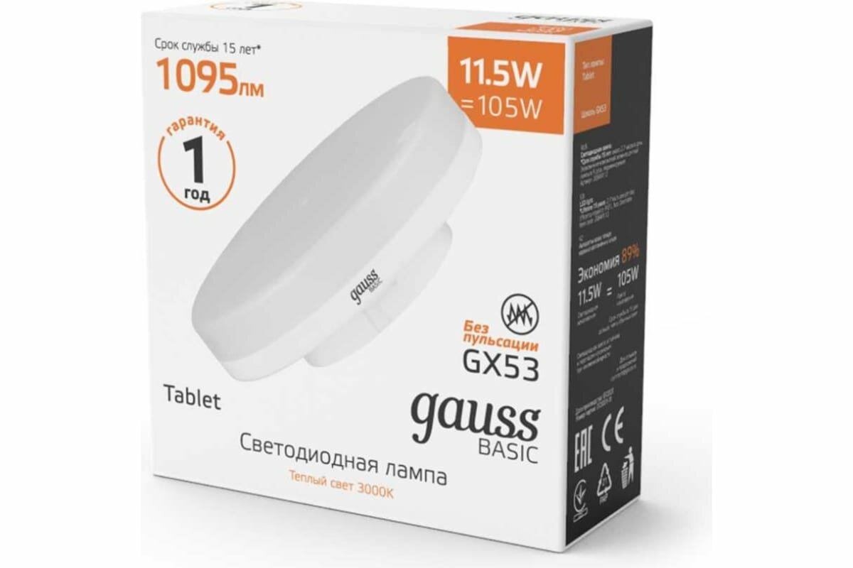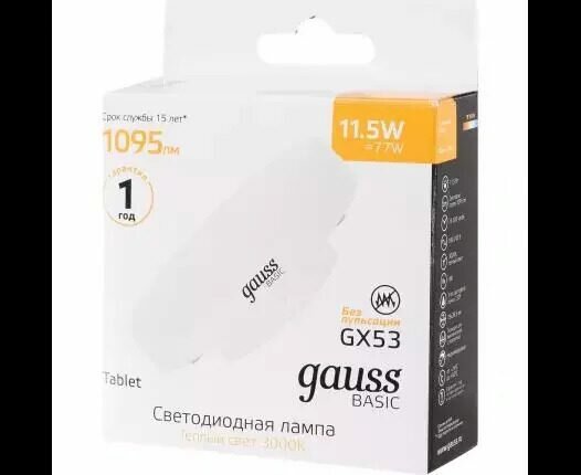 Лампа Gauss Basic, GX53, 11,5W, 1095lm, 3000K, LED, 20849112