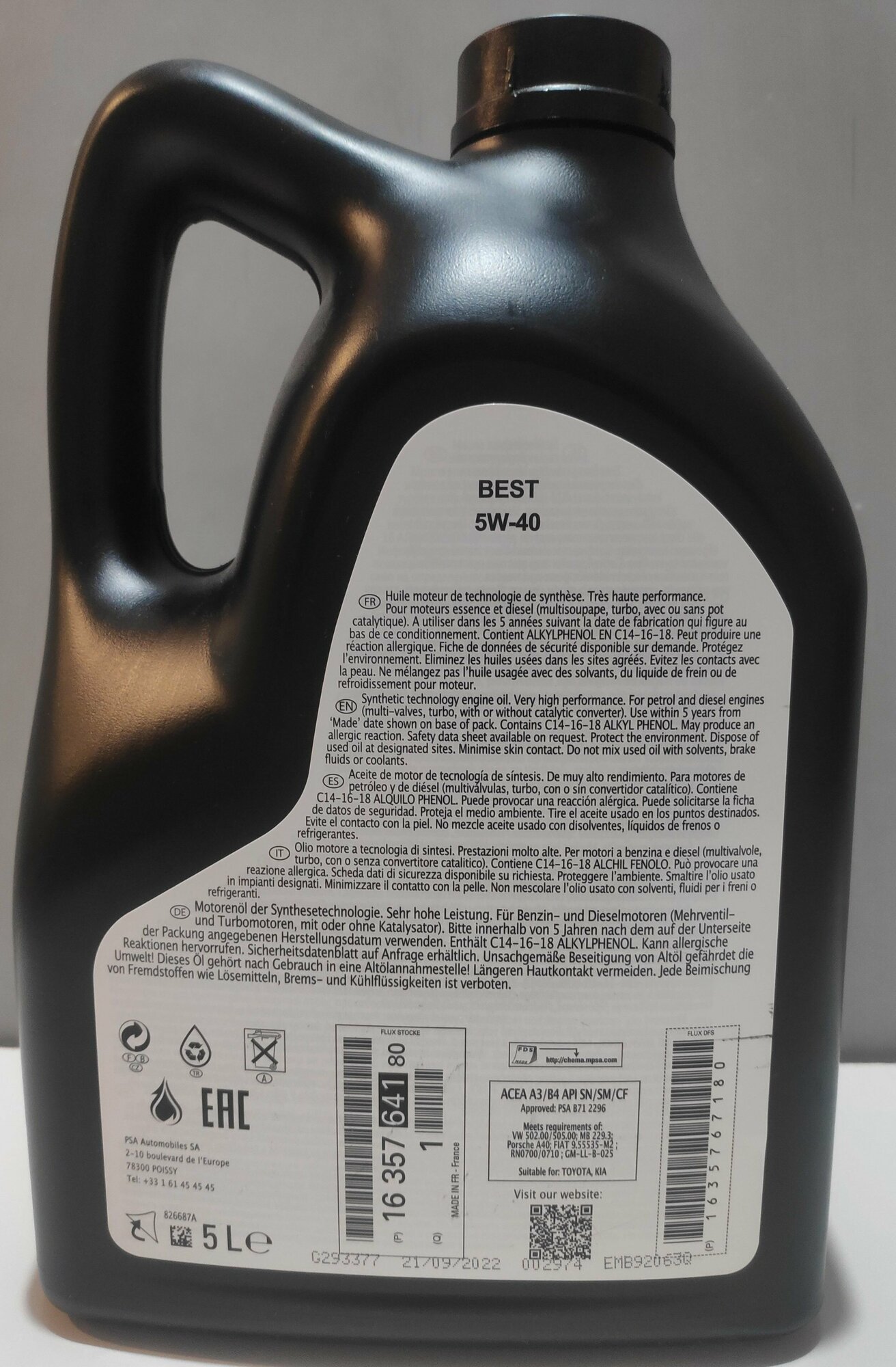 EUROREPAR 1635764180 Масло моторное синтетическое 5л - BEST 5W40, ACEA A3/B4, API SN/SM/CF, PSA B71 2296, VW 502.00/505.00, GM LL-B-025, Renault N0700/0710, MB 229.3, BMW LL-01 1шт