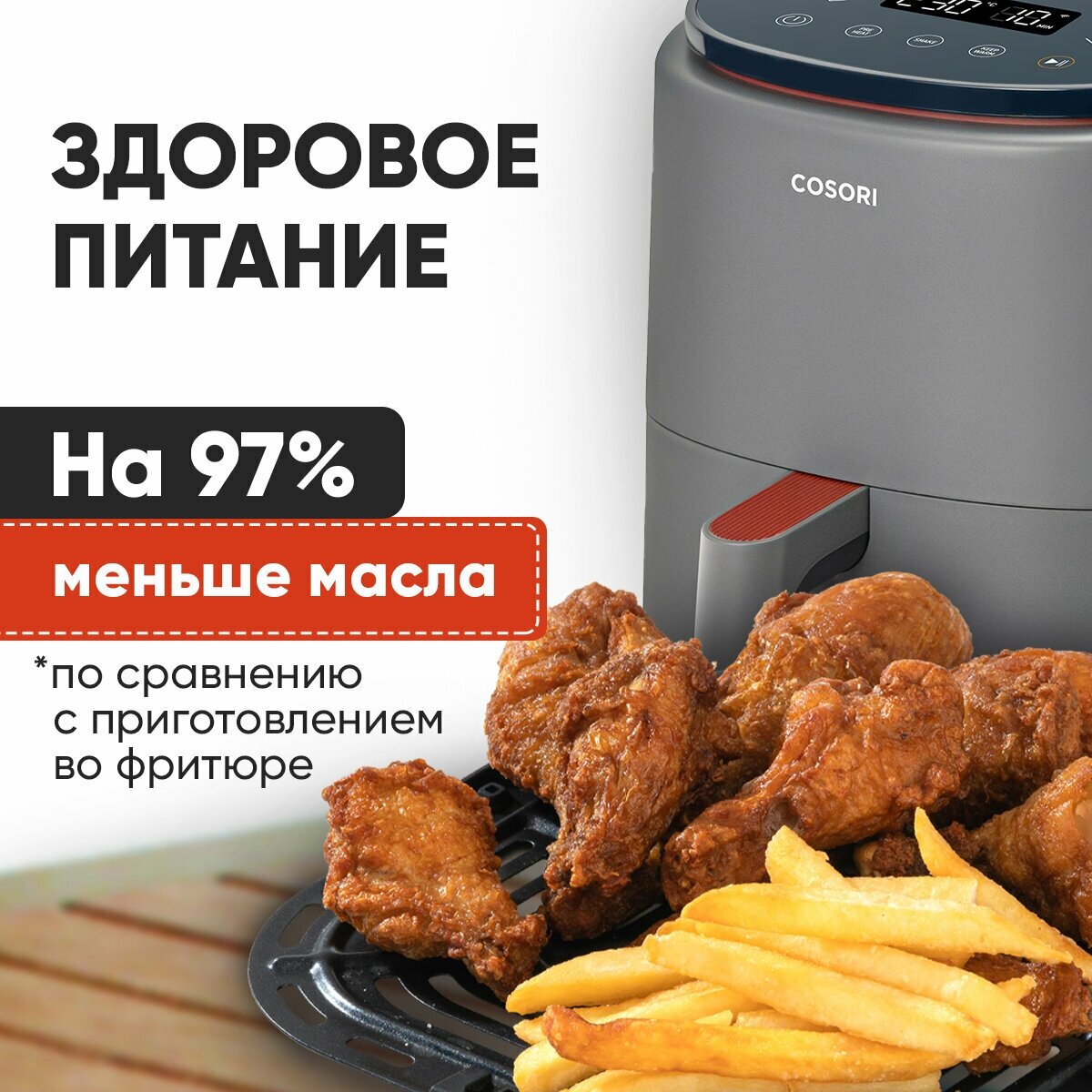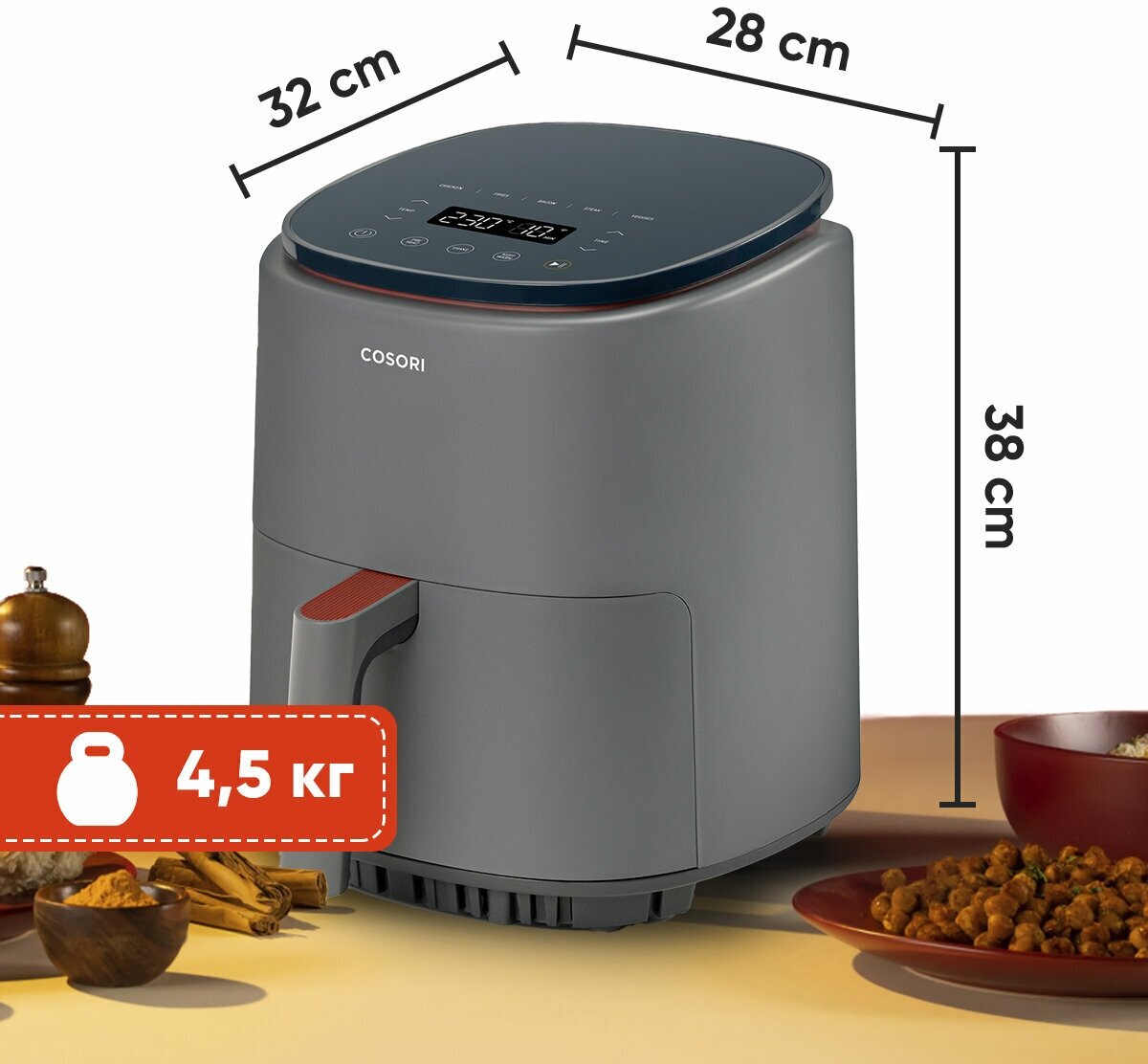 Красивый аэрогриль, в сером оттенке отлично вписался на моей кухне, такого же цвета. Готовлю пока каждый день и нам все нравится. Немного пришлось повозиться, чтобы подобрать оптимальные градусы и время приготовления для себя, но это никак не повлияло на мою любовь к Cosori.