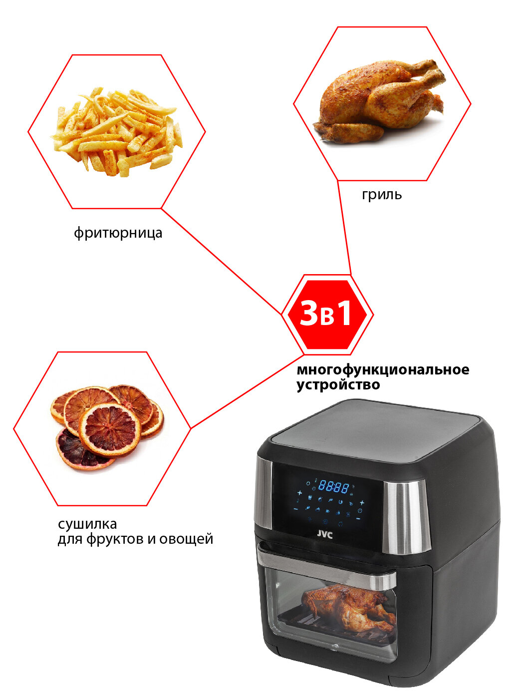 Аэрогриль JVC 12 л с антипригарным покрытием, таймер на 90 минут, 10 программ, функции гриля, аэрофритюрницы, сушилки для фруктов и овощей, 1800 Вт интересное: