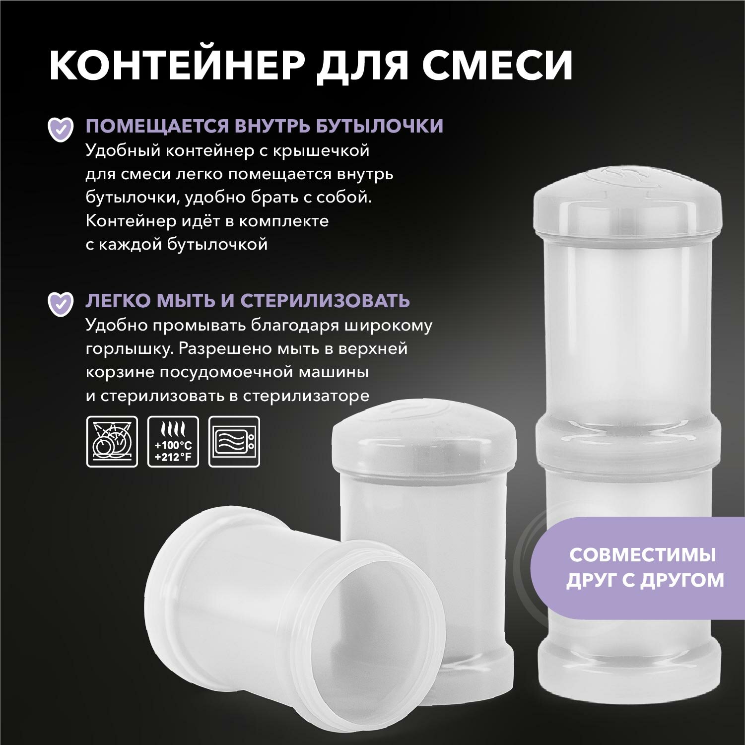 | Комплектация | бутылочка объемом 260 мл с соской, контейнер для хранения сухой смеси объемом 100 мл |