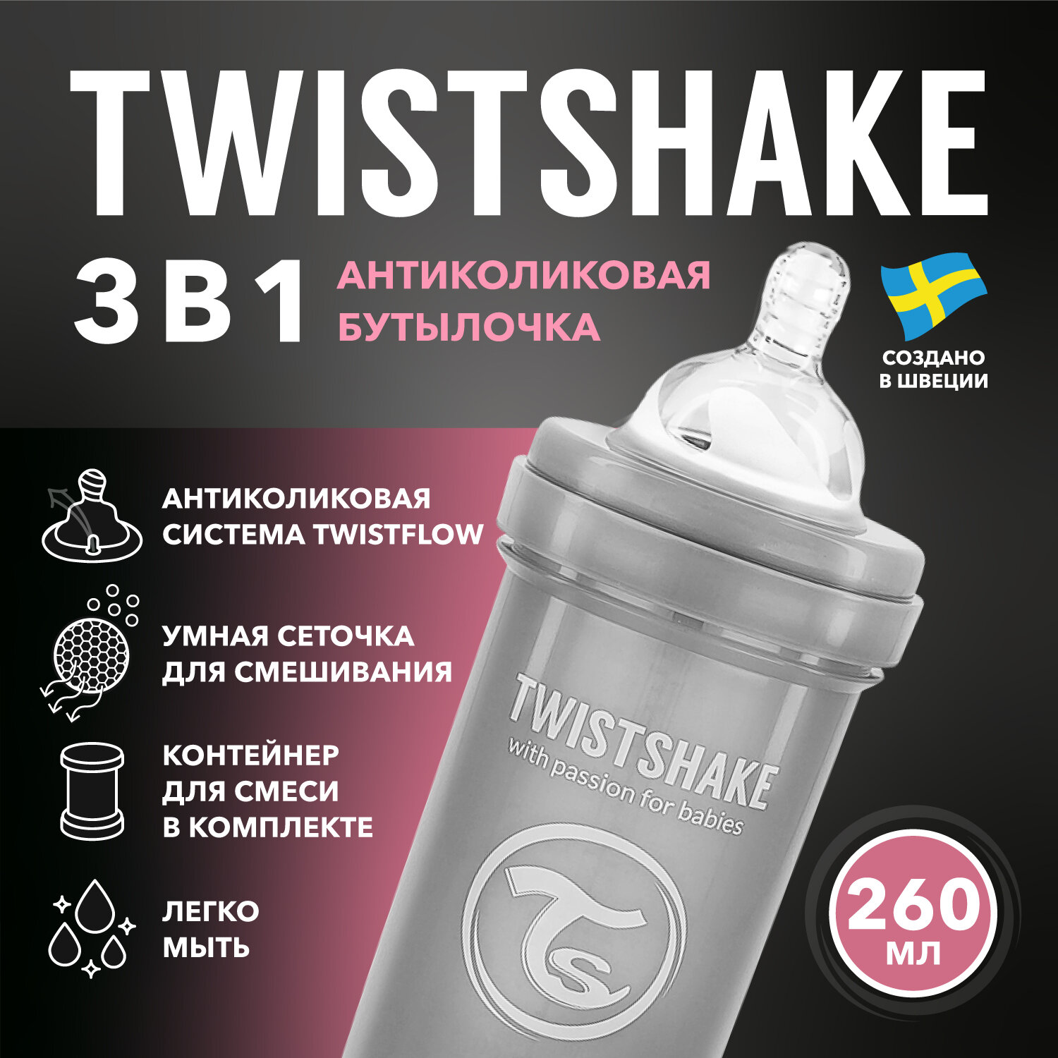 Детская антиколиковая бутылочка Twistshake для кормления, 260 мл, от 2+ мес. Светло-серый