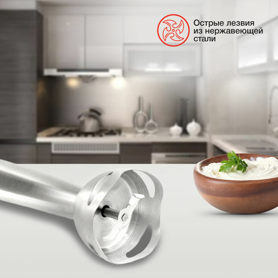 2. Качественные стальные ножи. 3. Венчик, насадка для измельчения в комплекте. |