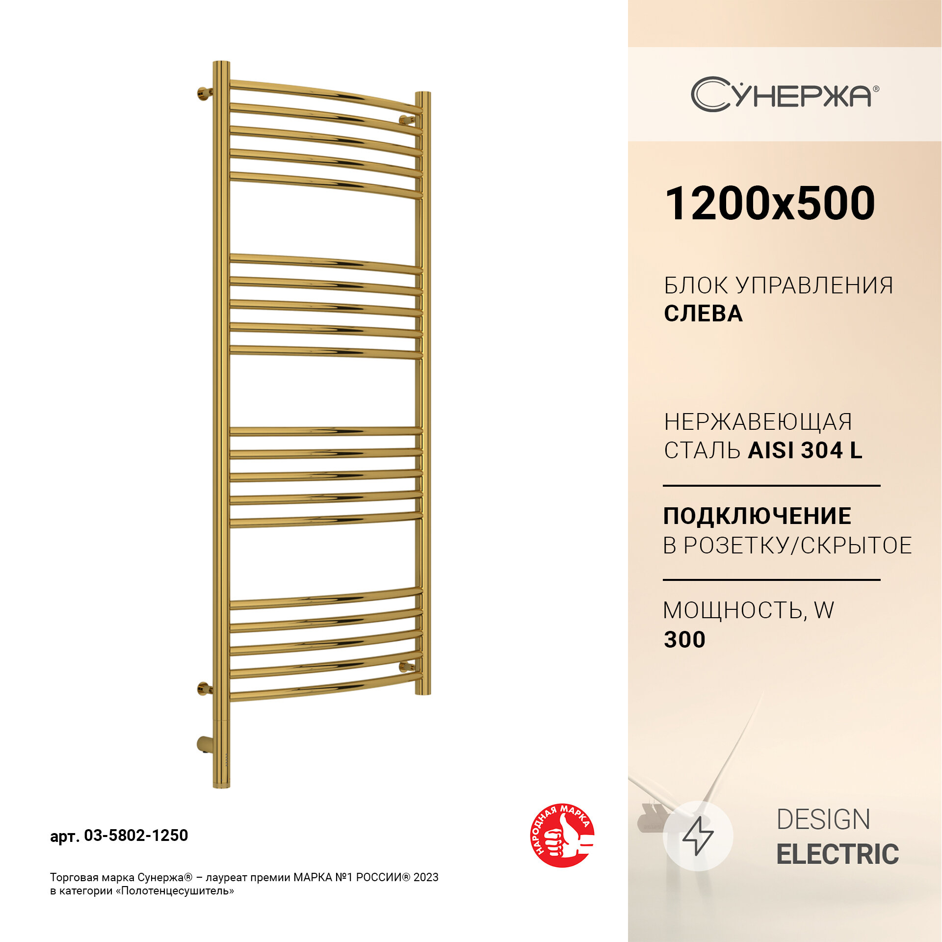 Электрический полотенцесушитель Сунержа Богема 3.0 выгнутая 1200x500 МЭМ Лев. золото арт. 03-5802-1250