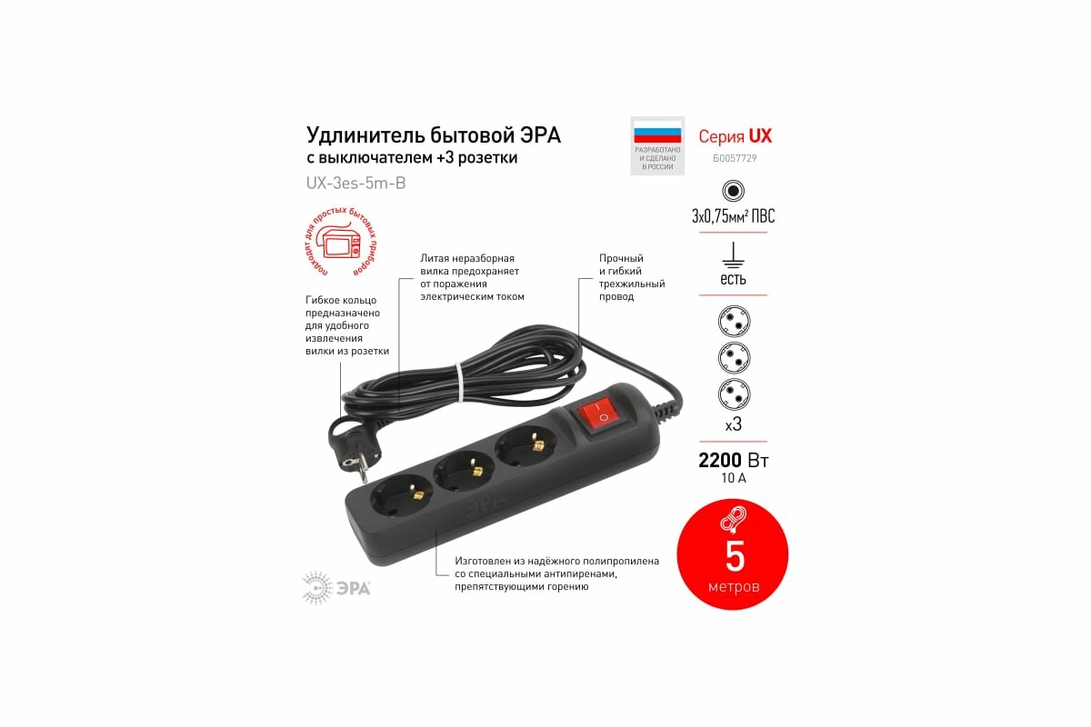 Удлинитель электрический UX-3es-5m-B с заземлением с выключателем 3 розетки 5м ПВС 3x0,75мм2 10, ЭРА Б0057729 (1 шт.)
