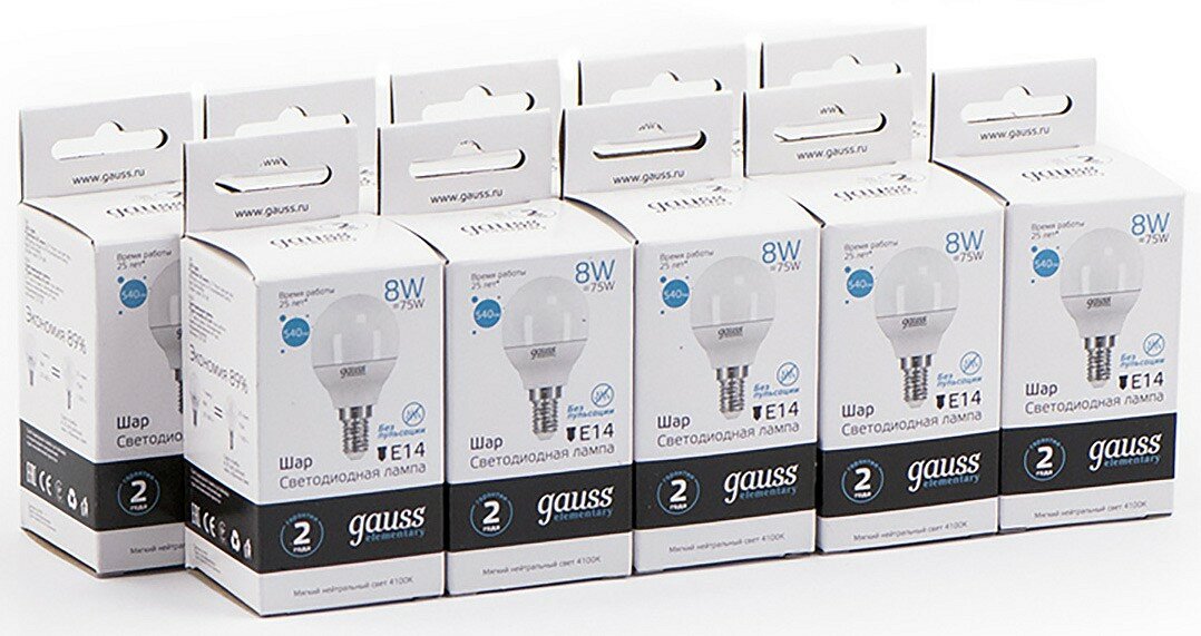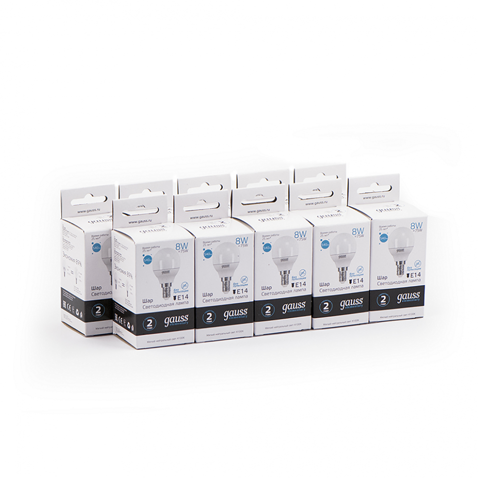 (10 шт)Лампа Gauss Elementary Шар 8W 540lm 4100K Е14 LED 1/10/100