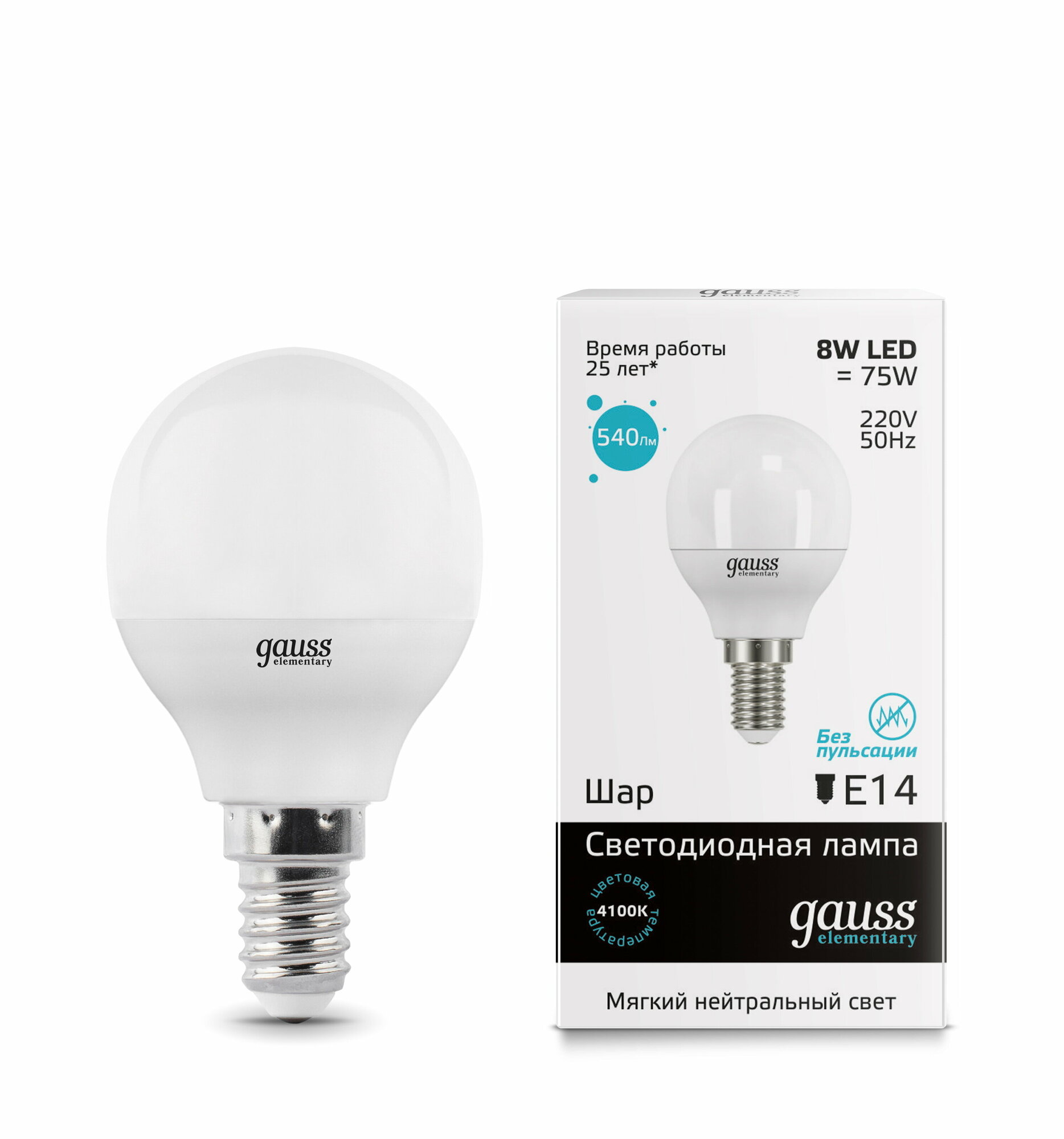 Лампа светодиодная Elementary 8Вт шар 4100К нейтр. бел. E14 540лм, GAUSS 53128 (1 шт.)
