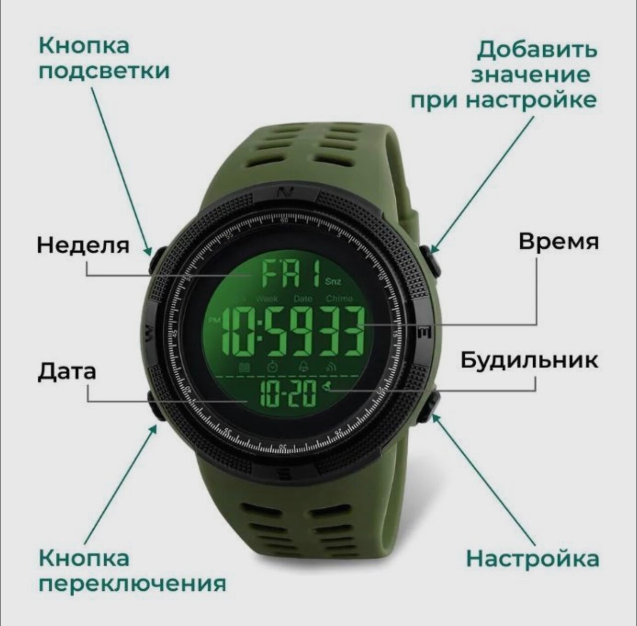 Часы мужские SKMEI 1251, водонепроницаемые, цвет зеленый милитари. Часы электронные.