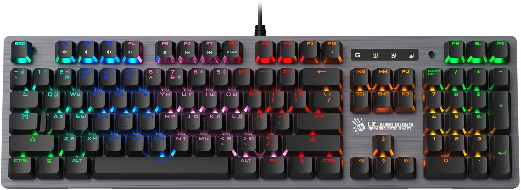 | Дополнительная информация | время отклика: 0.2 мс; частота опроса: 1000 Гц; мультимедийные горячие клавиши: есть; яркость подсветки: регулируемая; пробел: усиленный; ресурс клавиш: до 100 млн. нажатий; системные требования: Windows XP/ Vista/ 7/ 8 /8.1 / 10 и более поздние версии; модель переключателей: A4Tech LK Light Strike Black; тип переключателей: линейные; материал кейкапов ABS |