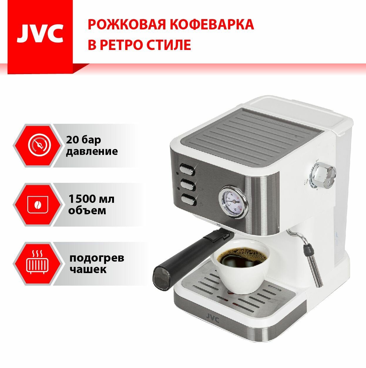 Кофеварка рожковая JVC со съемным резервуаром 1,5 л, двойным фильтром, подогревом чашек, 1050 Вт