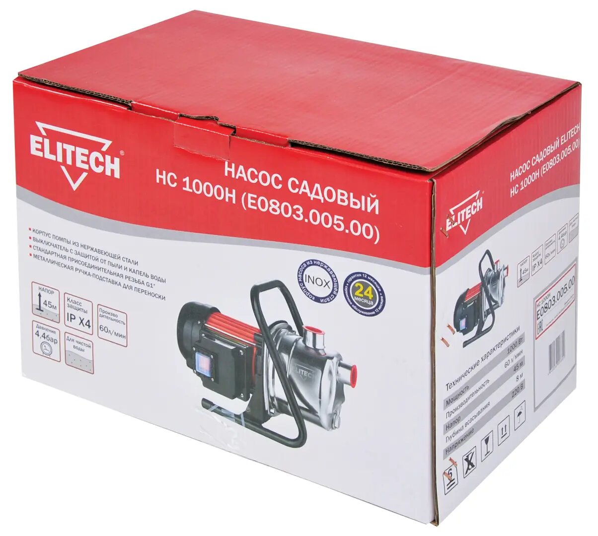 Насос поверхностный Elitech НС 1000Н 1000Вт,60л\м,Н=45м,Гл=8м,ч\вод,нерж