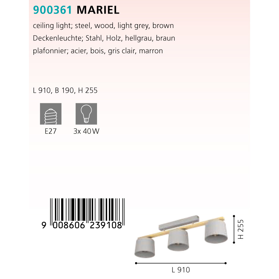 900361 Потолочный светильник MARIEL, 3x40W, E27, L910, B190, H255, сталь, дерево, светло-серый, коричневый