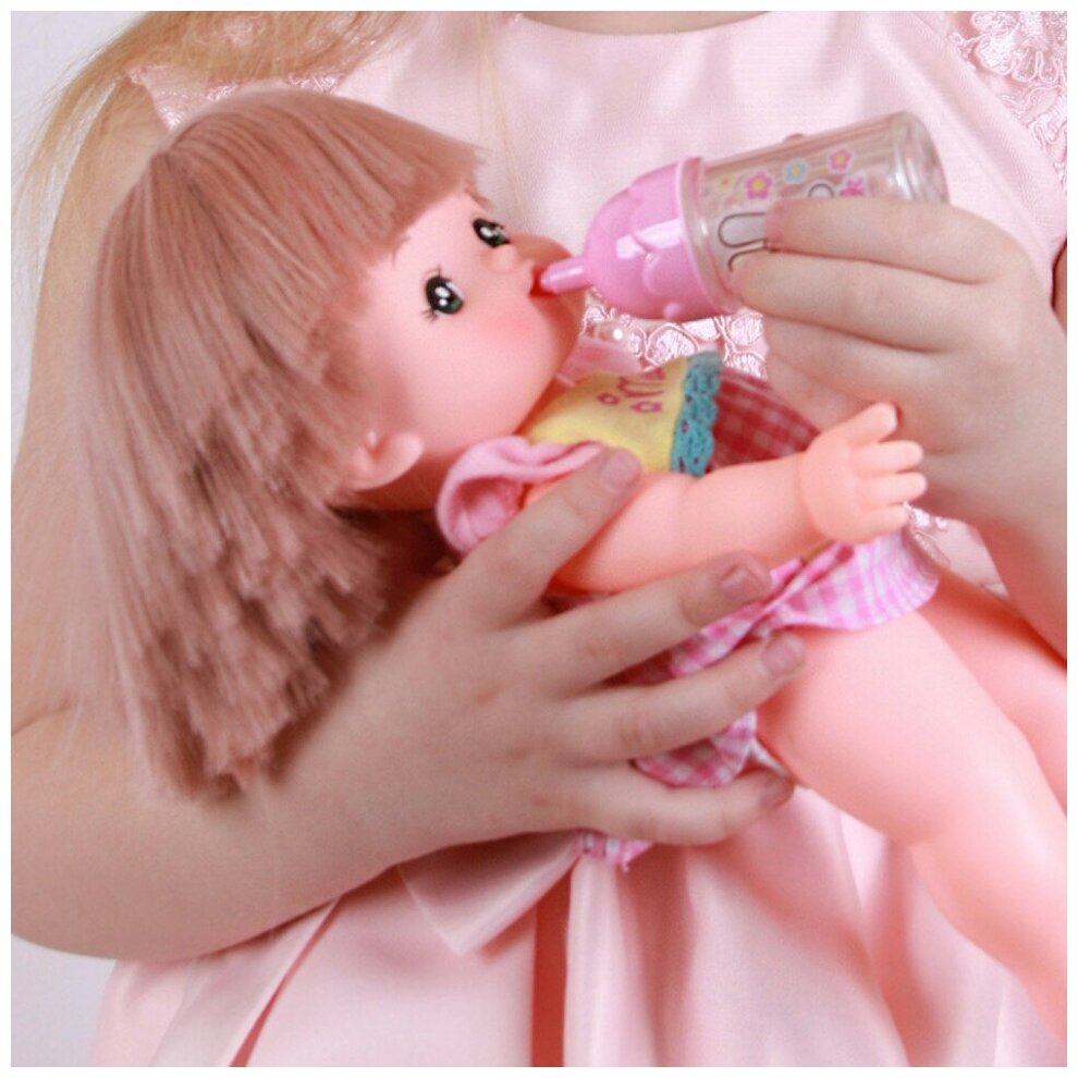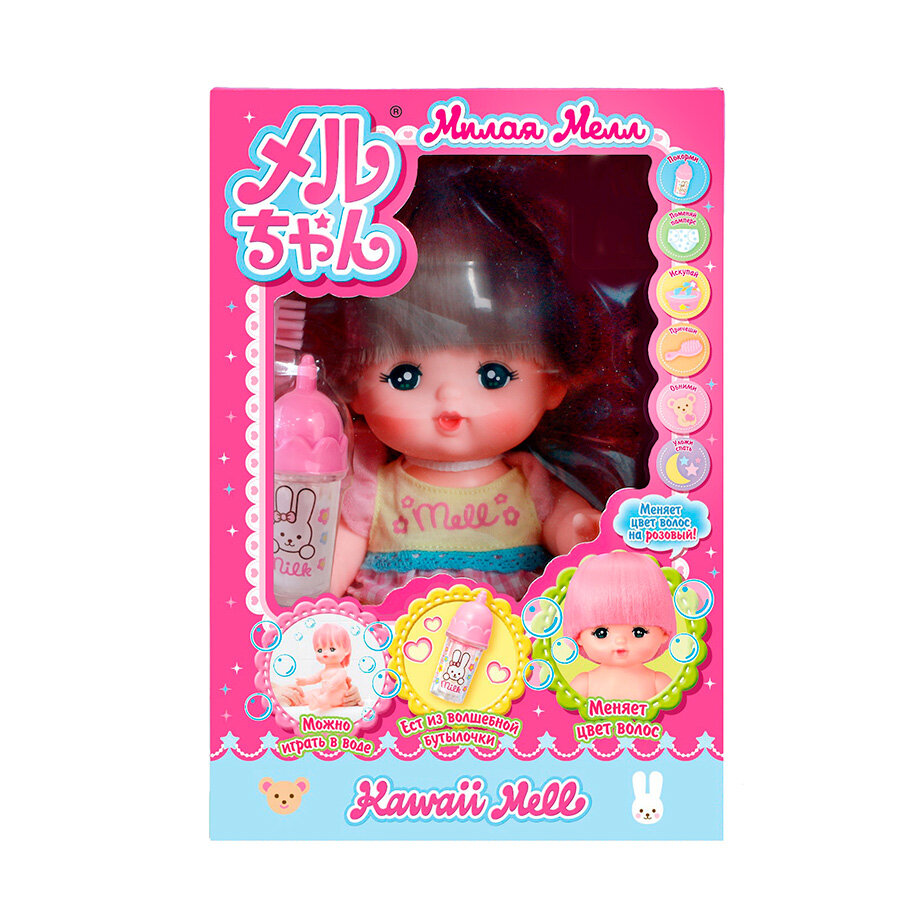 Игровой набор с куклой Kawaii Mell 512753 Милая Мелл Малышка 26 см, с бутылочкой и расческой, меняет цвет волос в воде на розовый