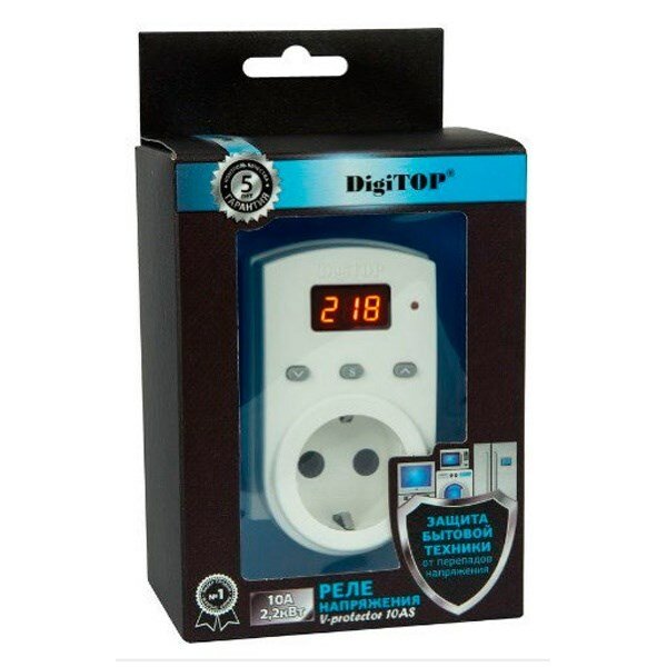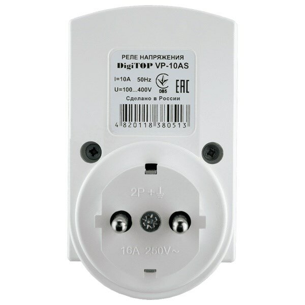 Реле напряжения DigiTOP Vp-10AS однофазное в розетку, 100-400В, макс. 10А, 5-600 сек.