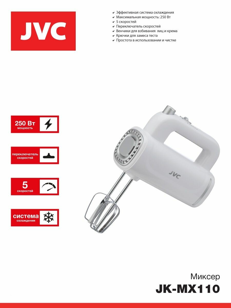 Купить Миксер ручной JVC домашний с эффективной системой охлаждения, 5 скоростей, 4 насадки, 250 Вт