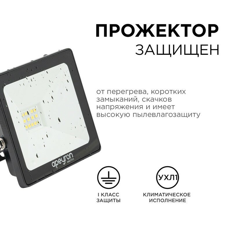 Apeyron Светодиодный прожектор LED 50Вт, 6500К, 4000 лм, Ip65, smd, 171х151х25мм, черный / 05-40 .