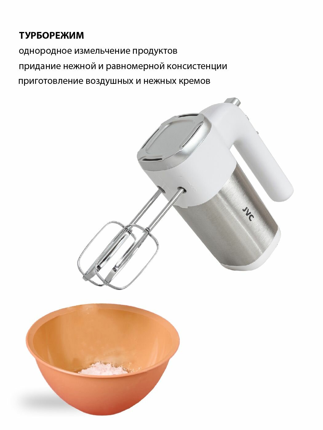 Миксер ручной JVC домашний с эффективной системой охлаждения, 5 скоростей, режим турбо, 4 насадки, 300 Вт интересное: