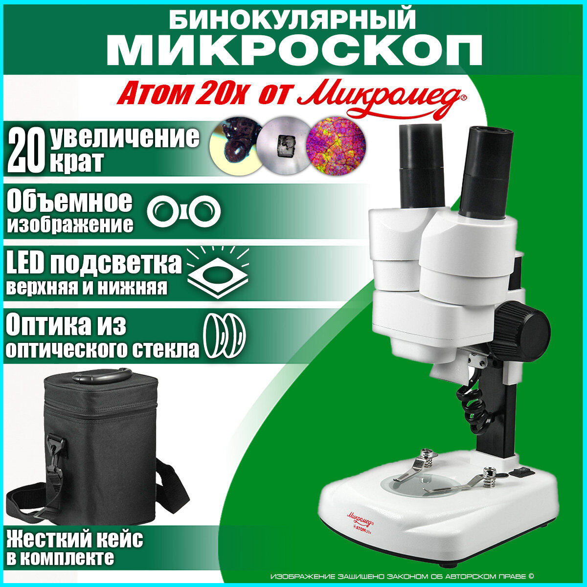 Микроскоп учебный бинокулярный стереоскопический Микромед Атом 20x, в кейсе белый интересное: