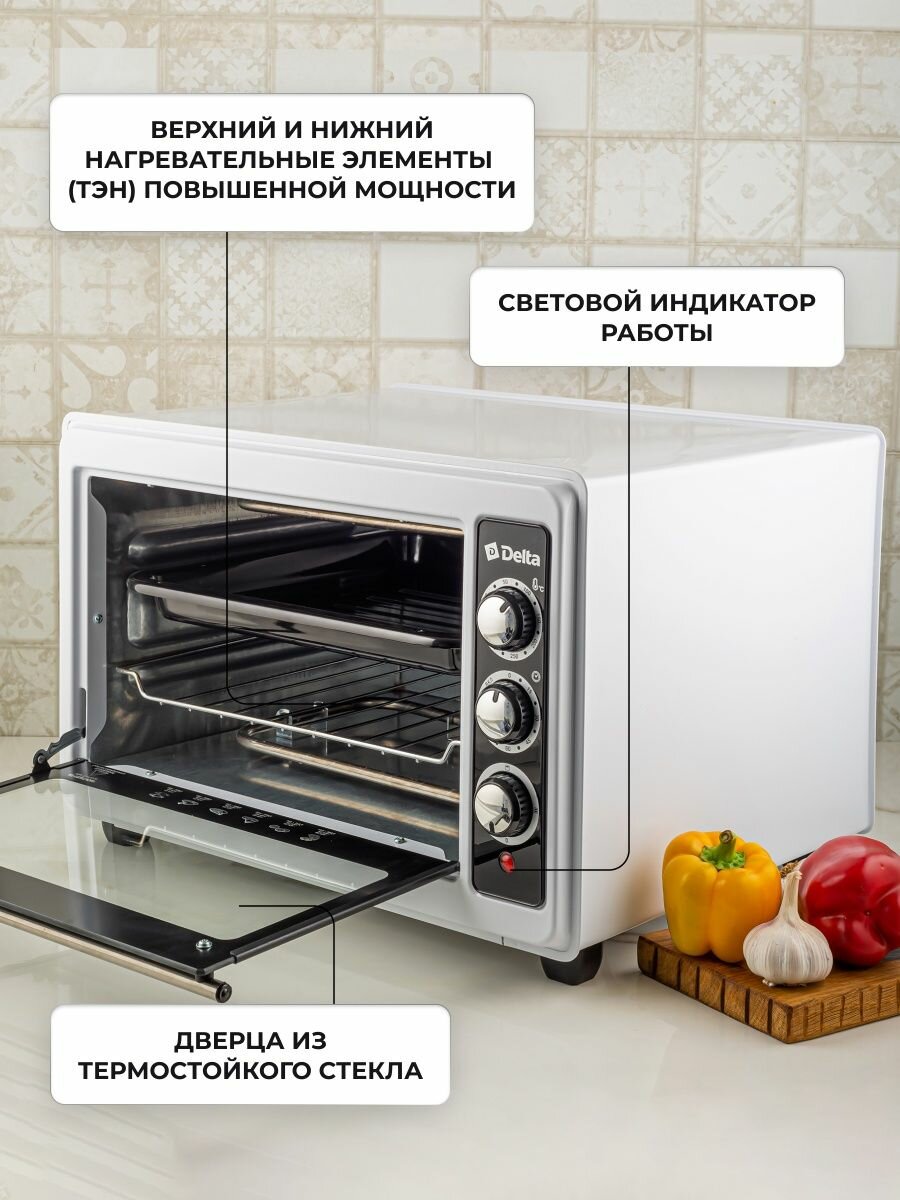 Духовка электрическая, Delta, D-0123, 37 л, 1300 Вт, с термостатом, тен повышенной мощности, 2 нагревательных элемента, белая