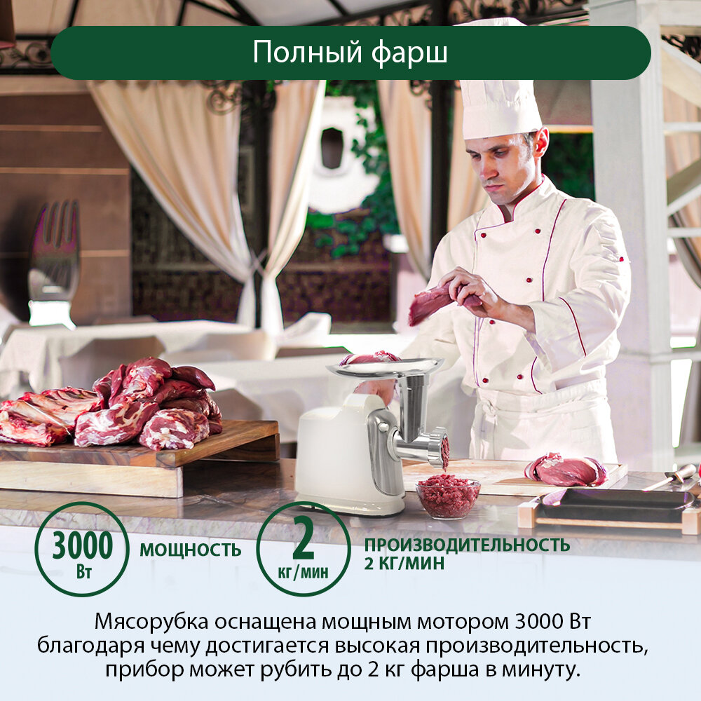 | Отзыв: | Взяли недавно такую мясорубку. У нее шикарная комплектация, куча разные насадок, для сока, колбас, печенья, терка, настоящие кухонный комбайн. Качество хорошее, фарш получается правильный. По столу не скользит, сборка добротная. |