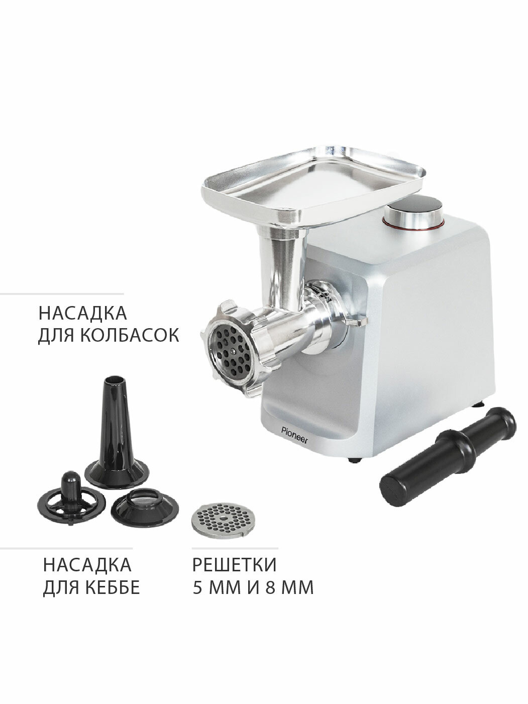 Купить Мясорубка Pioneer с реверсом, 4 скорости, насадки для колбасок и кеббе, 2 решетки 5 мм и 8 мм, 2500 Вт