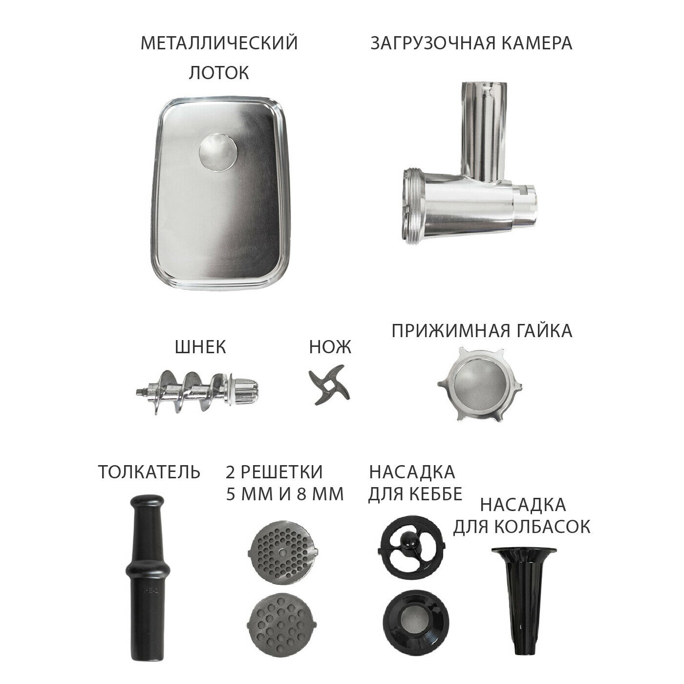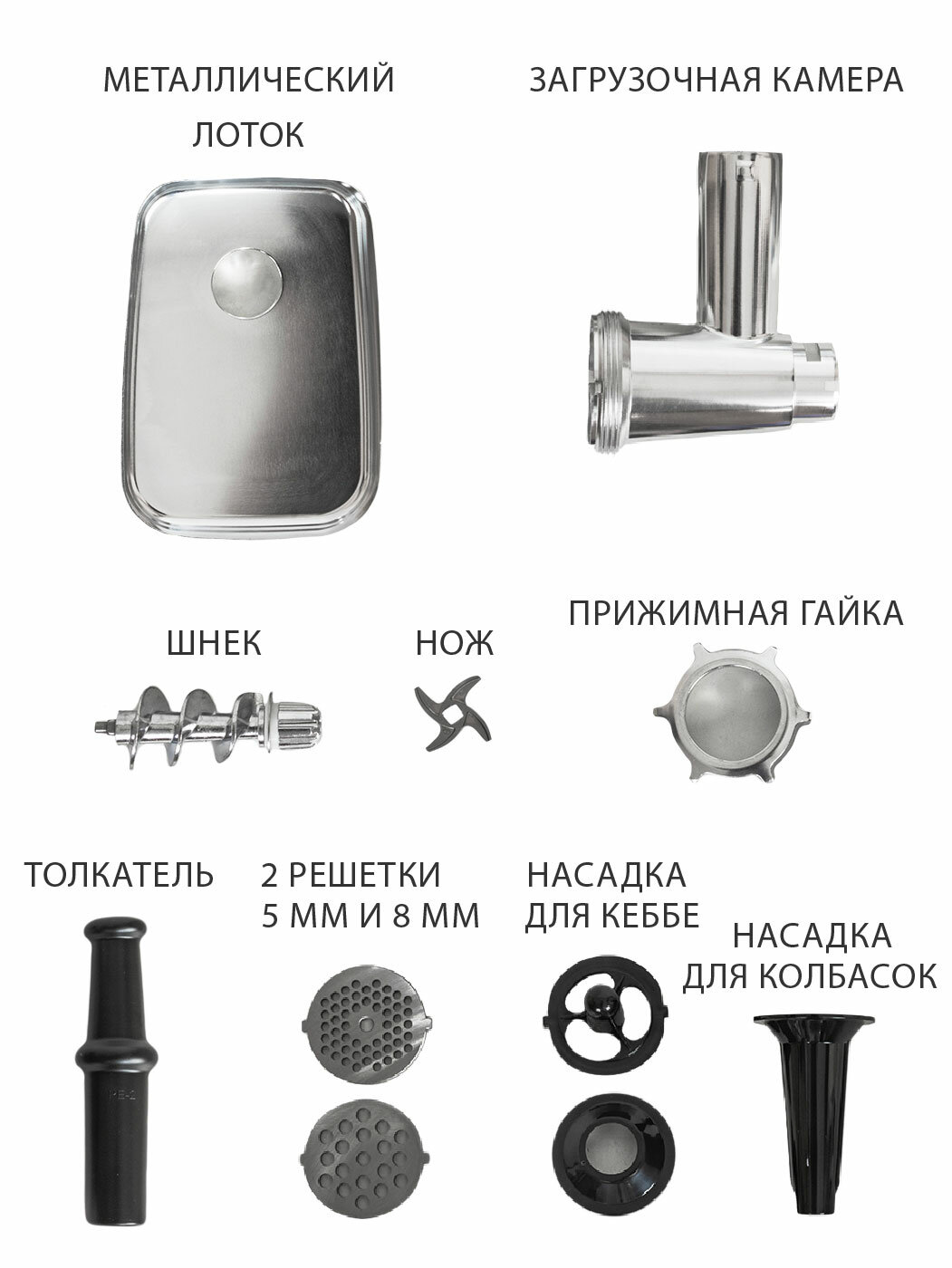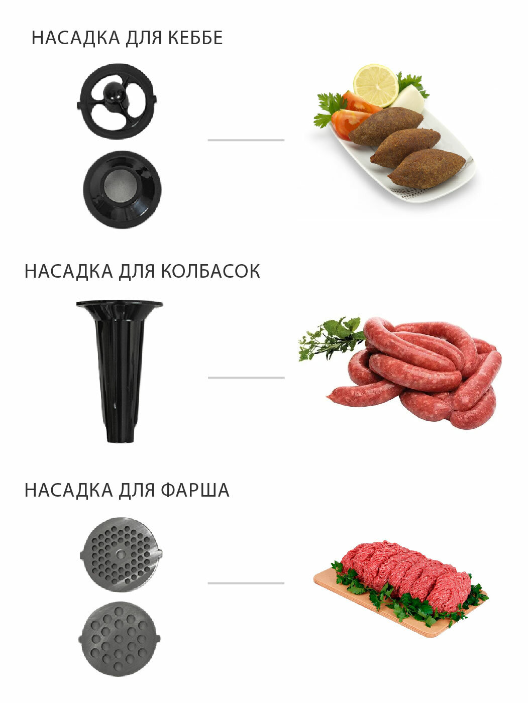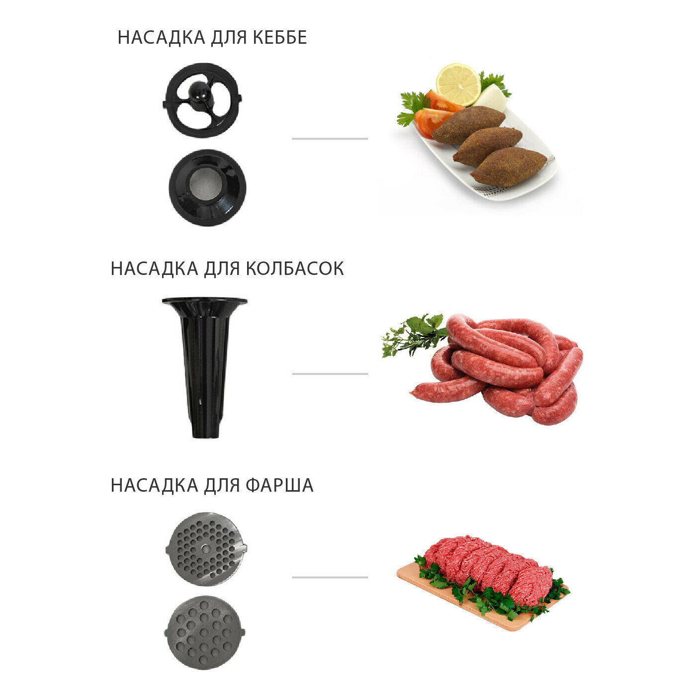 | Насадки | диск для фарша / насадка для кеббе / насадка для приготовления колбас |