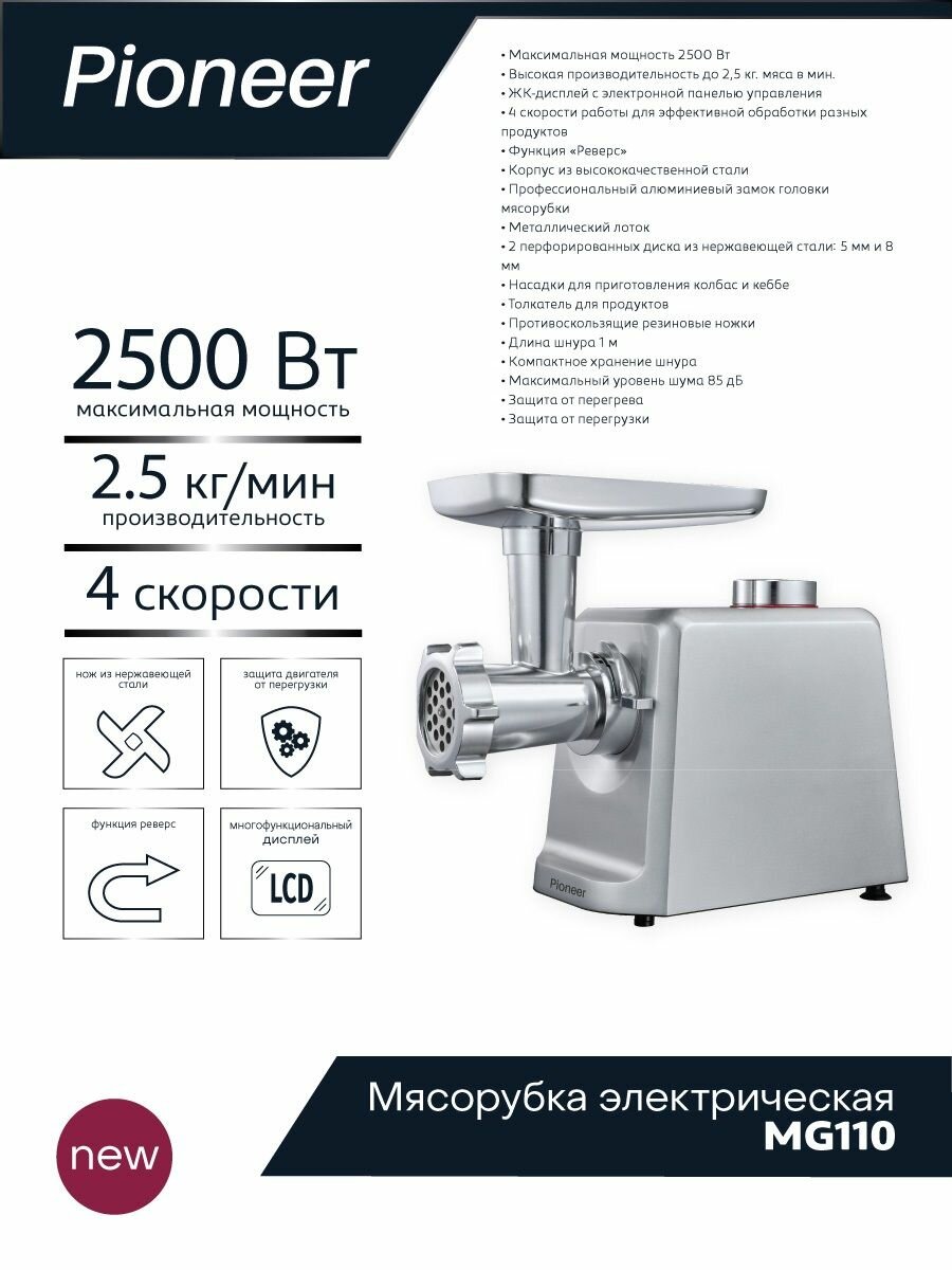 Мясорубка Pioneer MG110 с реверсом, 4 скорости, насадки для колбасок и кеббе, 2 решетки 5 мм и 8 мм, 2500 Вт