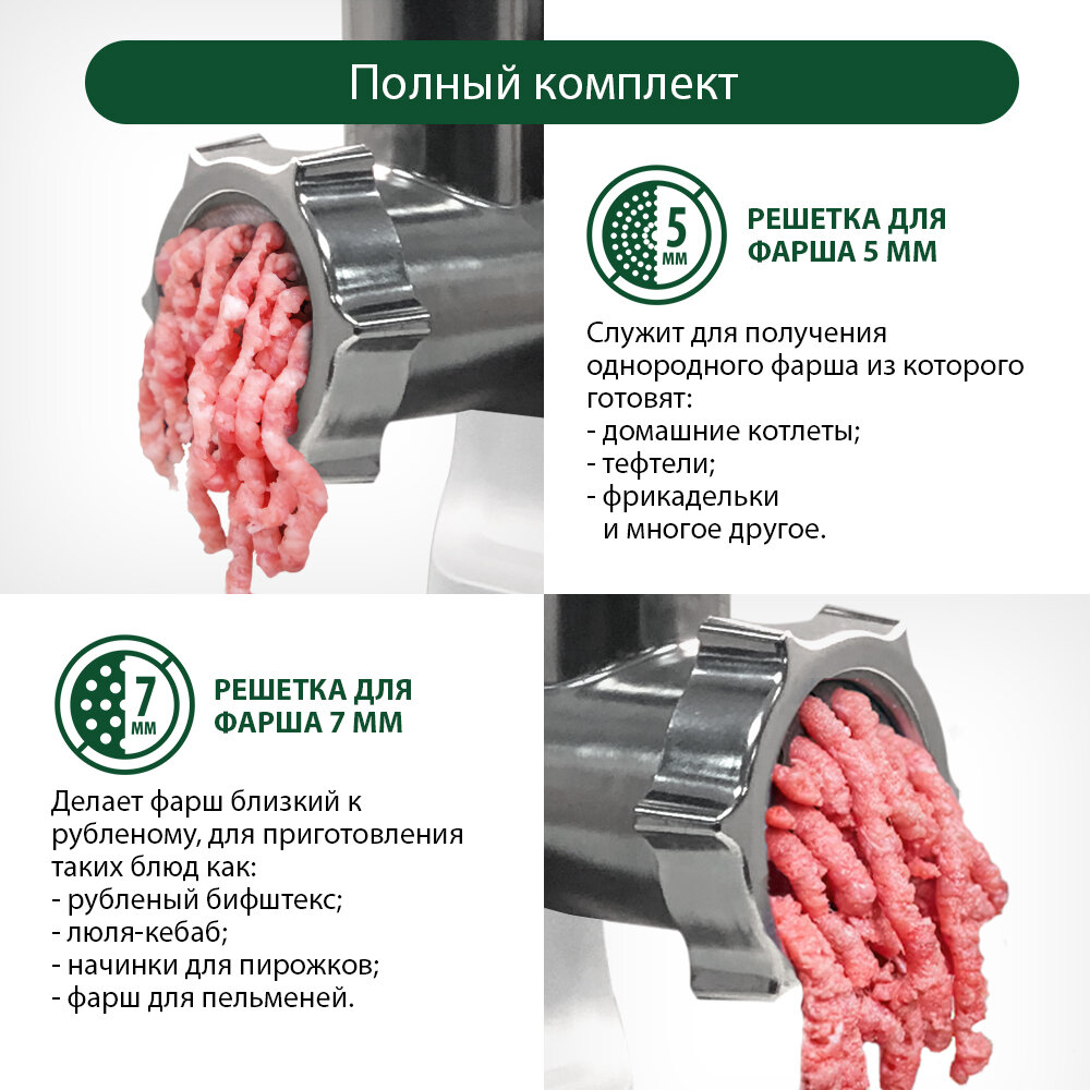 | Насадки | диск для фарша / насадка для кеббе / насадка для приготовления колбас / насадка-терка / соковыжималка |