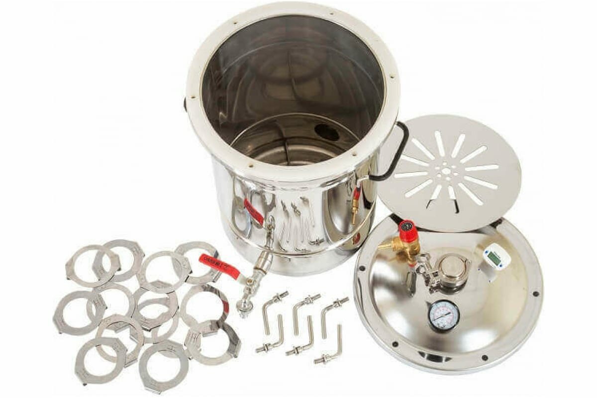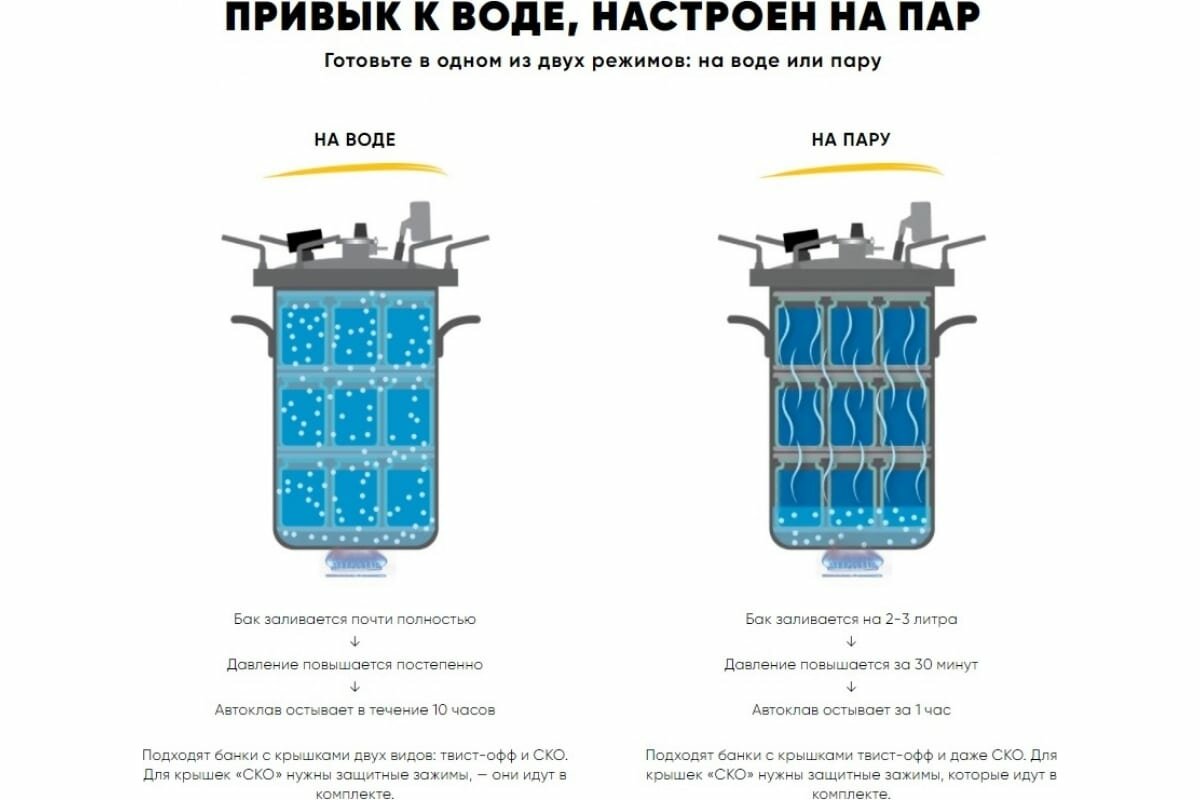 В итоге оторвалась гайка. огромное спасибо магазину. все устранил бесплатно. Самое большое разочарование это предельное давление в 1.5 бара. Если посмотреть в интернете, то все рецепты на 2.0 бара. Самое интересное в комплекте нет таблицы с продуктами и температурами. Поэтому очень сложно что-то определить самостоятельно. спасибо, что положили небольшую книгу рецептов в которой максимальная температура - 113 градусов. кто не знает, давление влияет на время стерилизации. плюс не все убивается температурой 113 градусов. Я считаю, что это огромный минус производителю. скрыть информацию от покупателя. Из советов начинающим берите с давлением 2.0 бара и с ТЭНом. не каждая плита выдержит вес автоклава загруженного под завязку. Воду заливать нужно по максимуму, спасибо, что это не упомянули в инструкции, даже если будете автоклавировать 1 банку. |