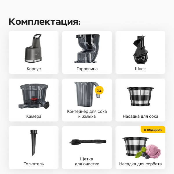 - Удобно мыть - Низкий уровень шума - Сухой жмых и очень равномерный цвет сока - Защита от перегрева - Прозрачные контейнеры для жмыха и сока - Есть книга рецептов, где указано в том числе что можно делать со жмыхом |