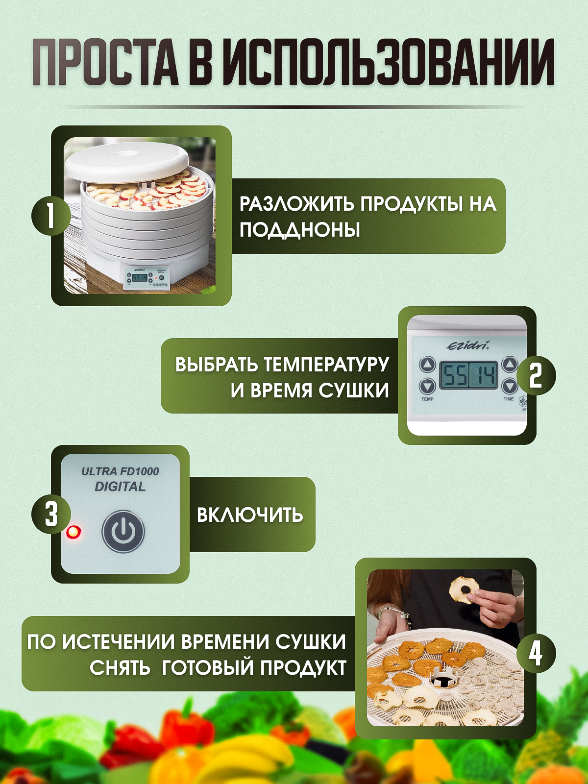 Ниже Вы можете прочитать отзывы на Комплект Ezidri FD1000 Digital с 10 поддонами, 5 листами для пастилы и 5 сетчатыми листами, ознакомится с подробными характеристиками, посмотреть интересные обзоры и фотографии на Комплект Ezidri FD1000 Digital с 10 поддонами, 5 листами для пастилы и 5 сетчатыми листами.
