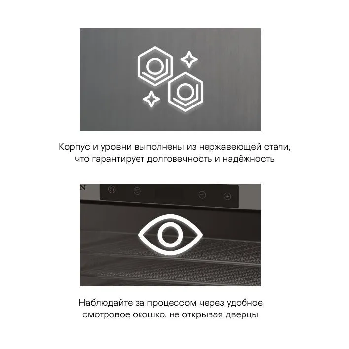 | Плюсы: | Отличная вместимость, широкий выбор температур для сушки (до 75°С), 10 решёток, 10 сеток и 10 поддонов! Удобно быть внутри. |