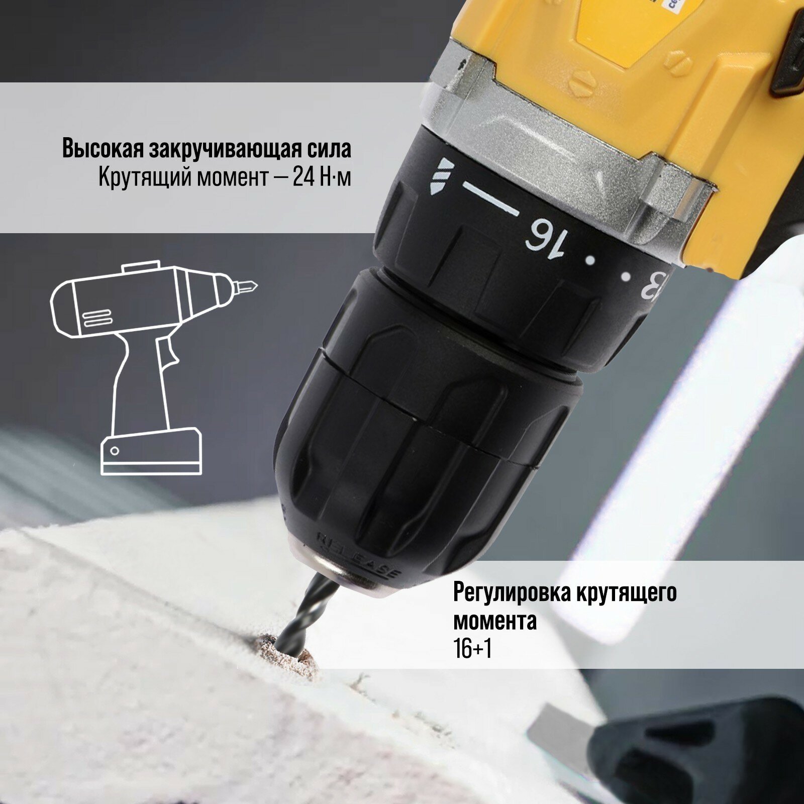 Шуруповерт, патрон БЗ до 10 мм, подсветка, Li-ion 1300 mAh 16V, 550 об/мин, 24 Н*м
