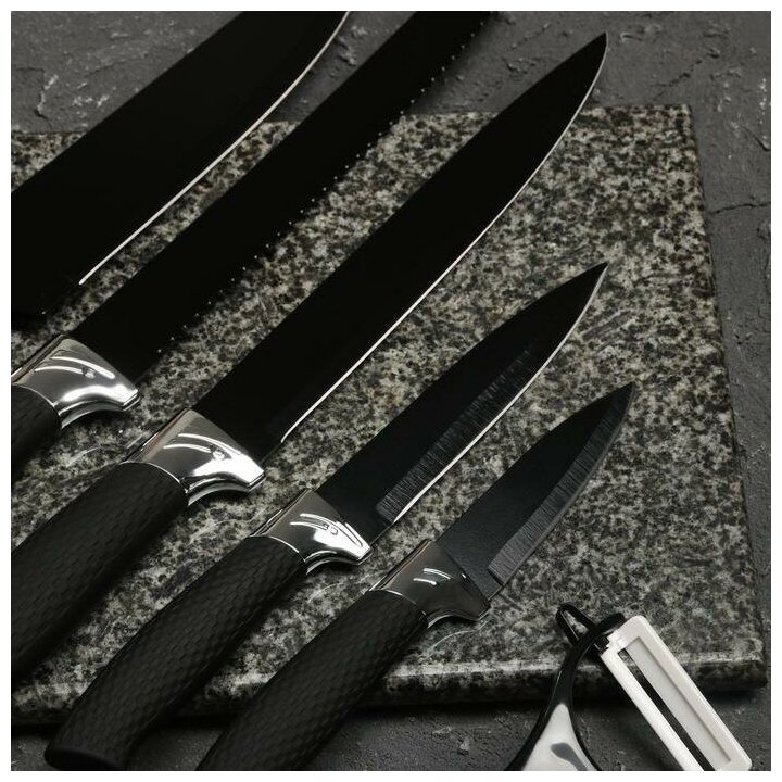 Набор кухонных ножей с овощечисткой Доляна «Супер-блек» 6 предметов, антиналипающее покрытие, цвет черный