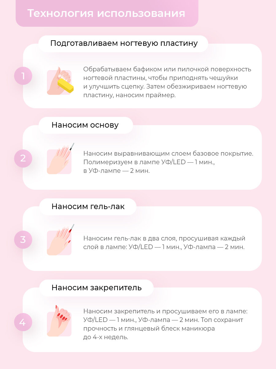 | Плюсы: | Достаточно густой, не затекает под кутикулу, не полосит, ложится ровно с первого слоя |
